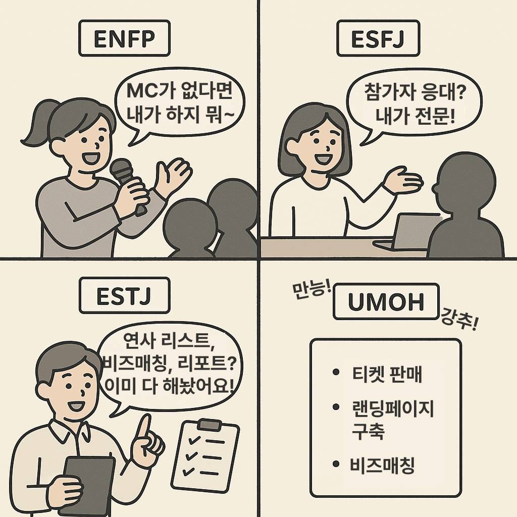 행사 준비, 현장 운영, 그리고 사후 보고서까지…누군가에겐 지옥일 수 있는 이 일들이 누군가에겐 또 놀이터처럼 느껴지기도 하죠.이런 업무 스타일, 사실 MBTI에 따라 다르다는 말, 믿으시나요?