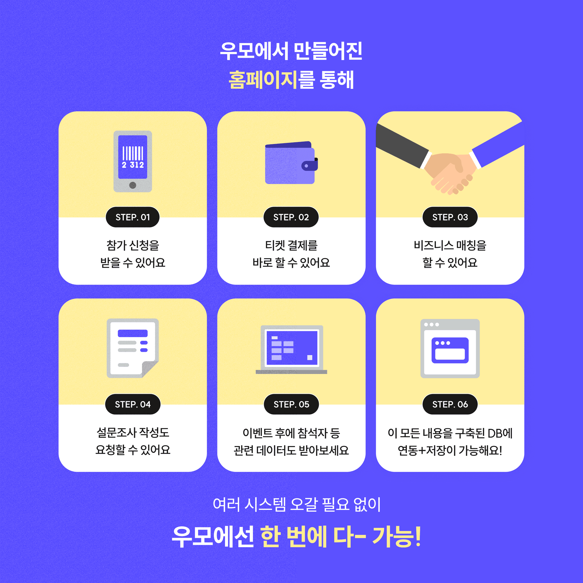 ์šฐ๋ชจ๋Š” ๋‹จ์ˆœํžˆ ํŽ˜์ด์ง€๋ฅผ ๋งŒ๋“œ๋Š” ํˆด์ด ์•„๋‹ˆ๋ผ,์ด๋ฒคํŠธ ์ „๋ฐ˜์„ ๊ด€๋ฆฌํ•˜๋Š” ์šด์˜ ์‹œ์Šคํ…œ๊ณผ ์—ฐ๊ฒฐ๋œ โ€˜ํ™ˆํŽ˜์ด์ง€ ๋นŒ๋”โ€™์ž…๋‹ˆ๋‹ค.