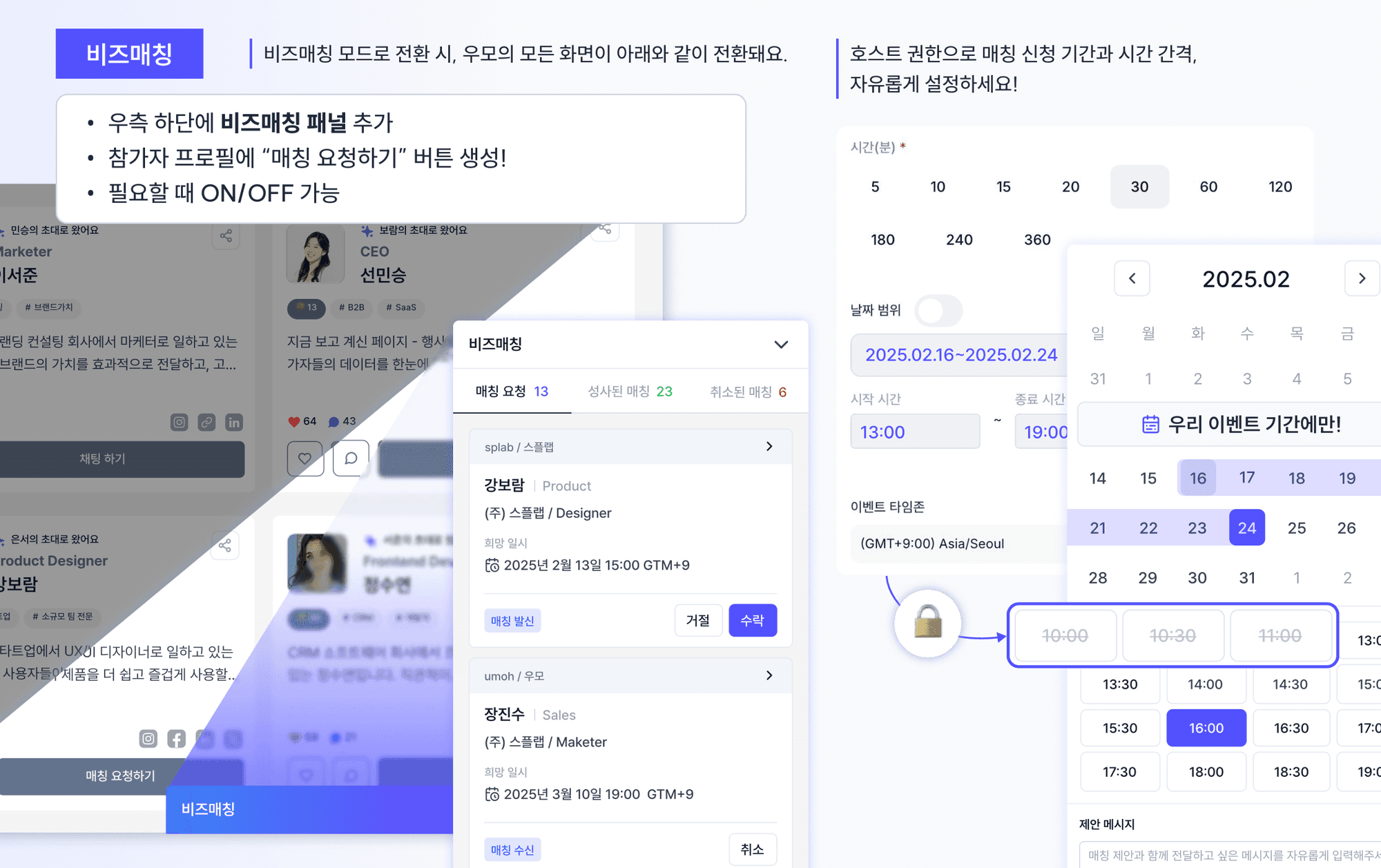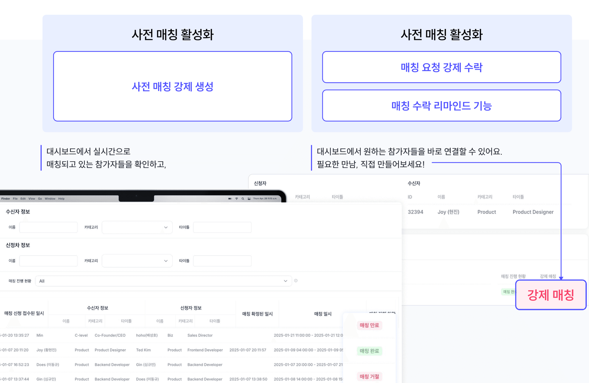 때로는 참가자들 간의 자발적인 매칭만으로는 중요한 만남을 성사시키기에 부족할 수 있습니다. 운영자가 직접 참가자들을 매칭할 수 있는 기능이 필요합니다.