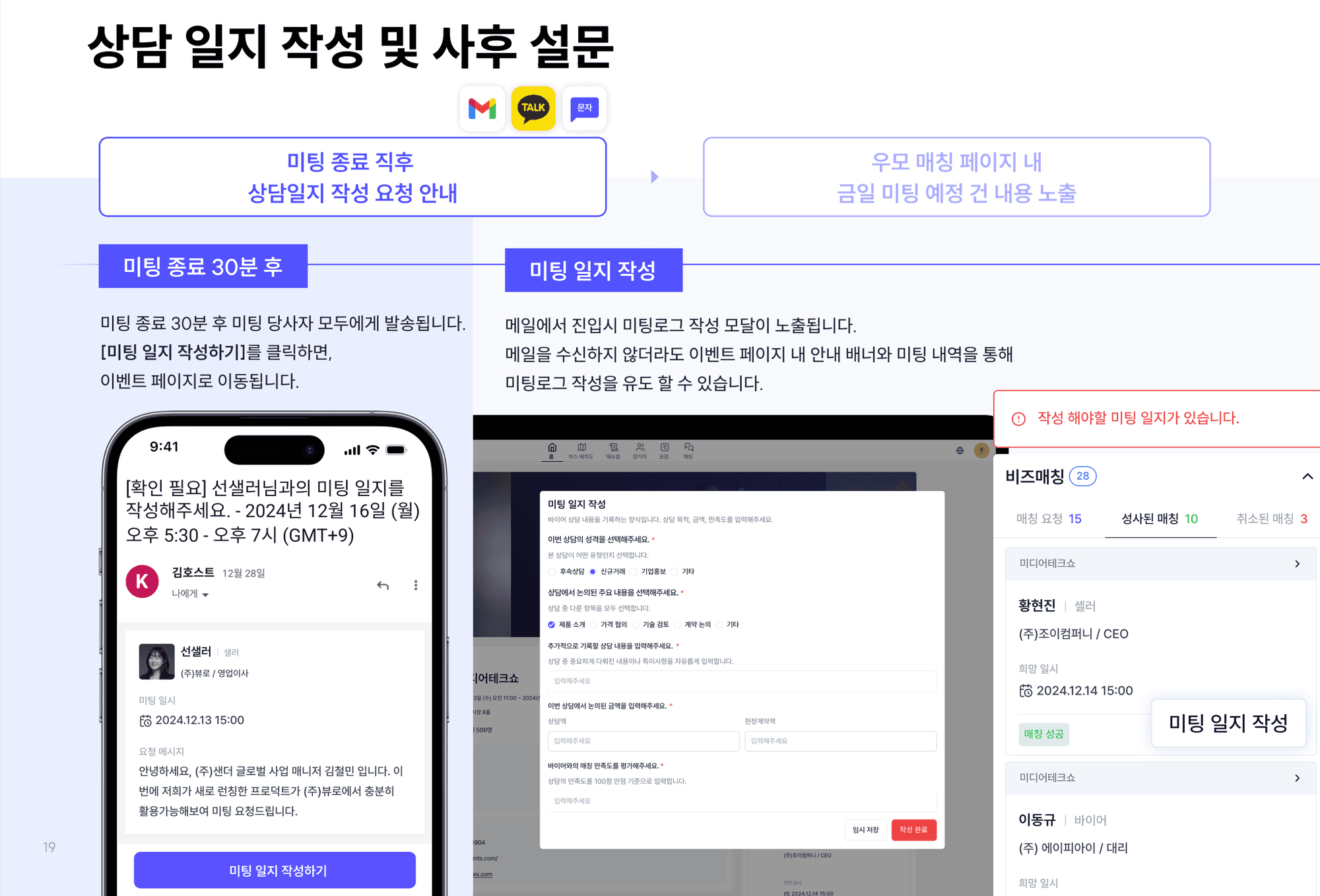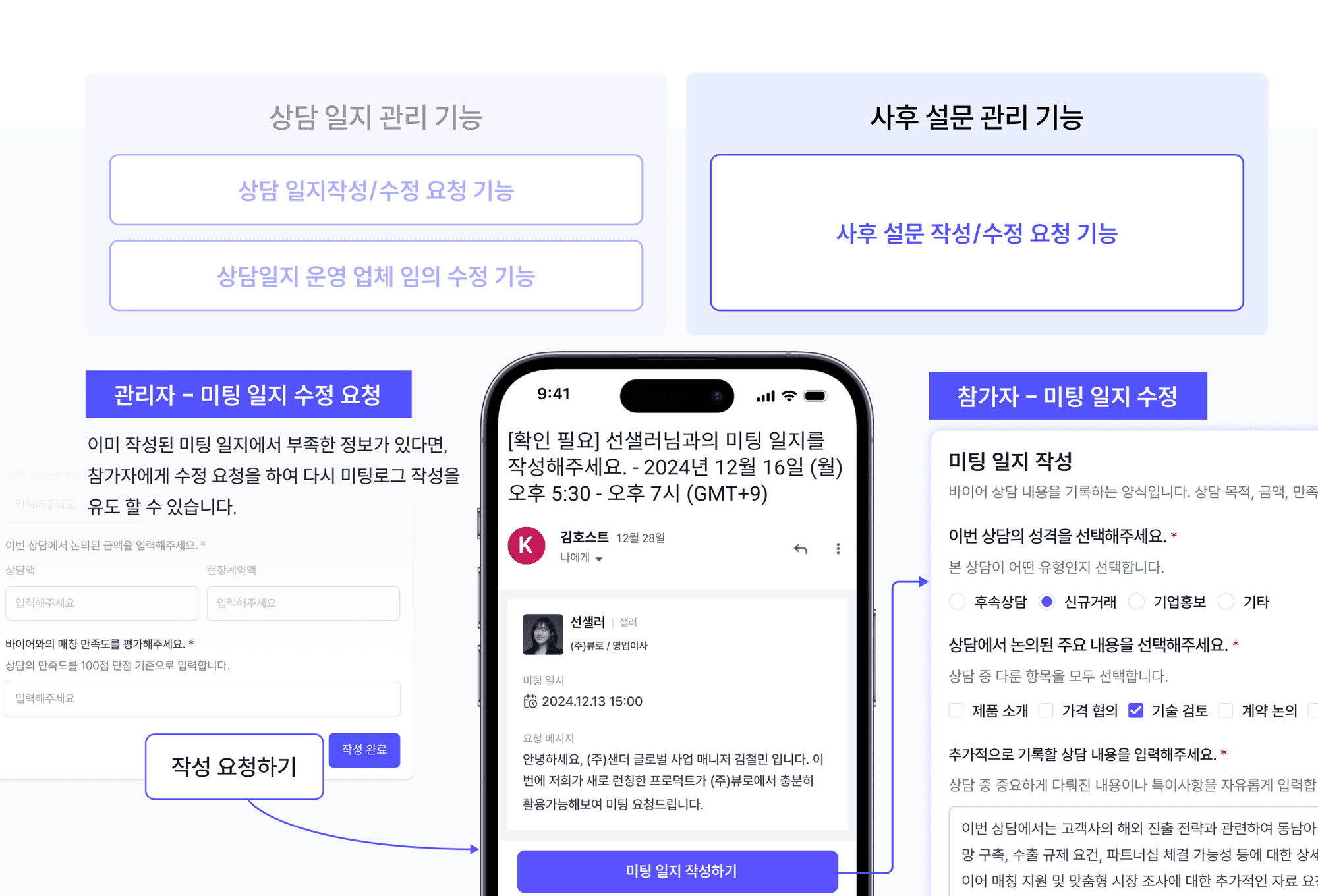 • 후속 미팅을 원활하게 진행할 수 있도록 상담 일지 및 만족도 조사 기능 적용