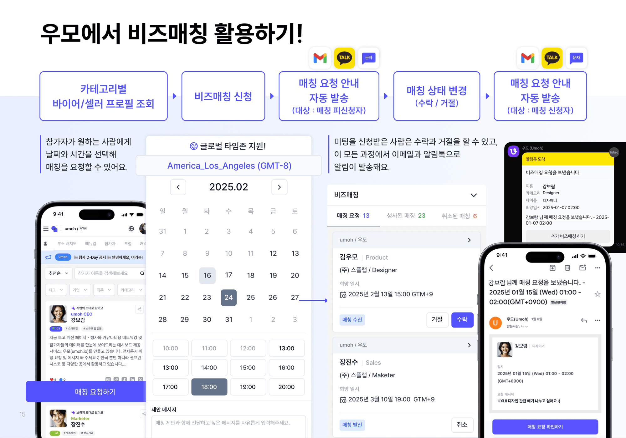 우모에서는 참가자들이 원활하게 비즈니스 매칭을 진행할 수 있도록 일정 조율, 상담 성사율 관리, 상담 후속 조치까지 체계적으로 지원하고 있습니다. 이를 위해 다음과 같은 핵심 기능이 필요합니다.