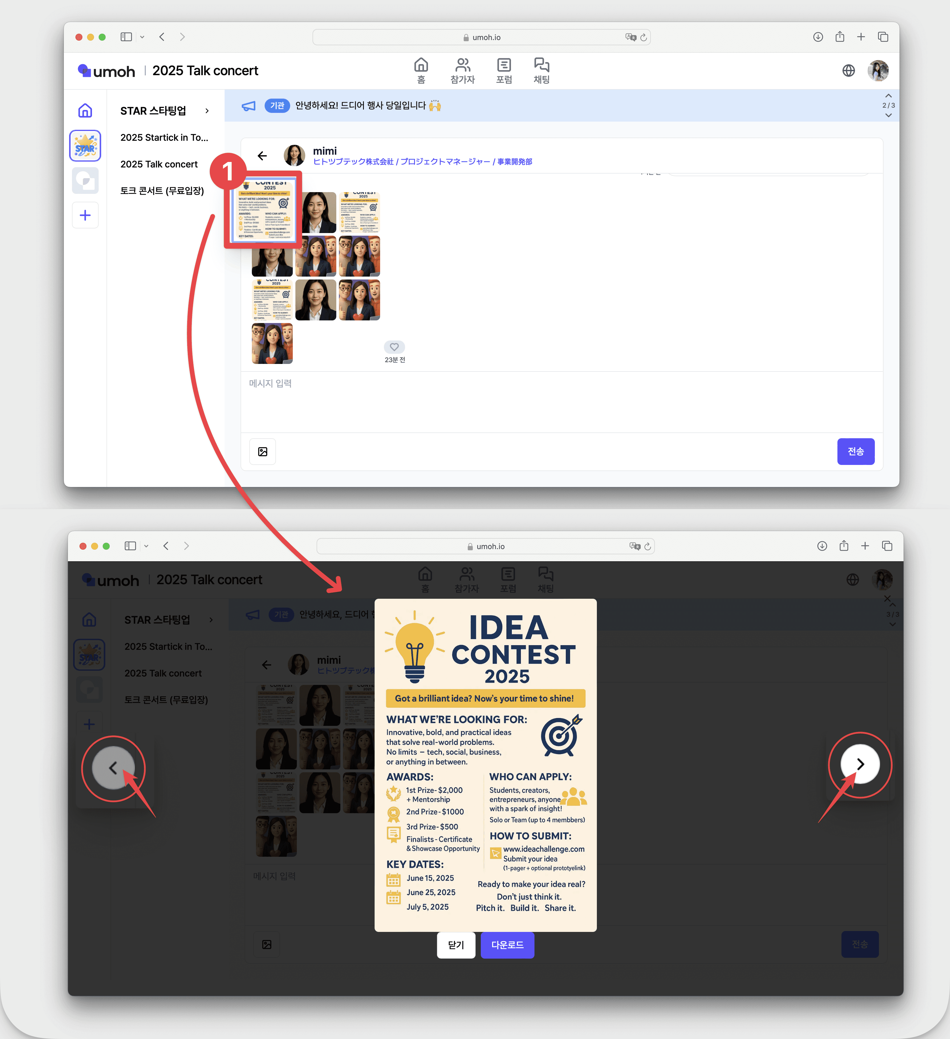 [사진] 클릭 → 양 옆 [<], [>] 버튼 클릭 → 사진 넘기며 확인 가능