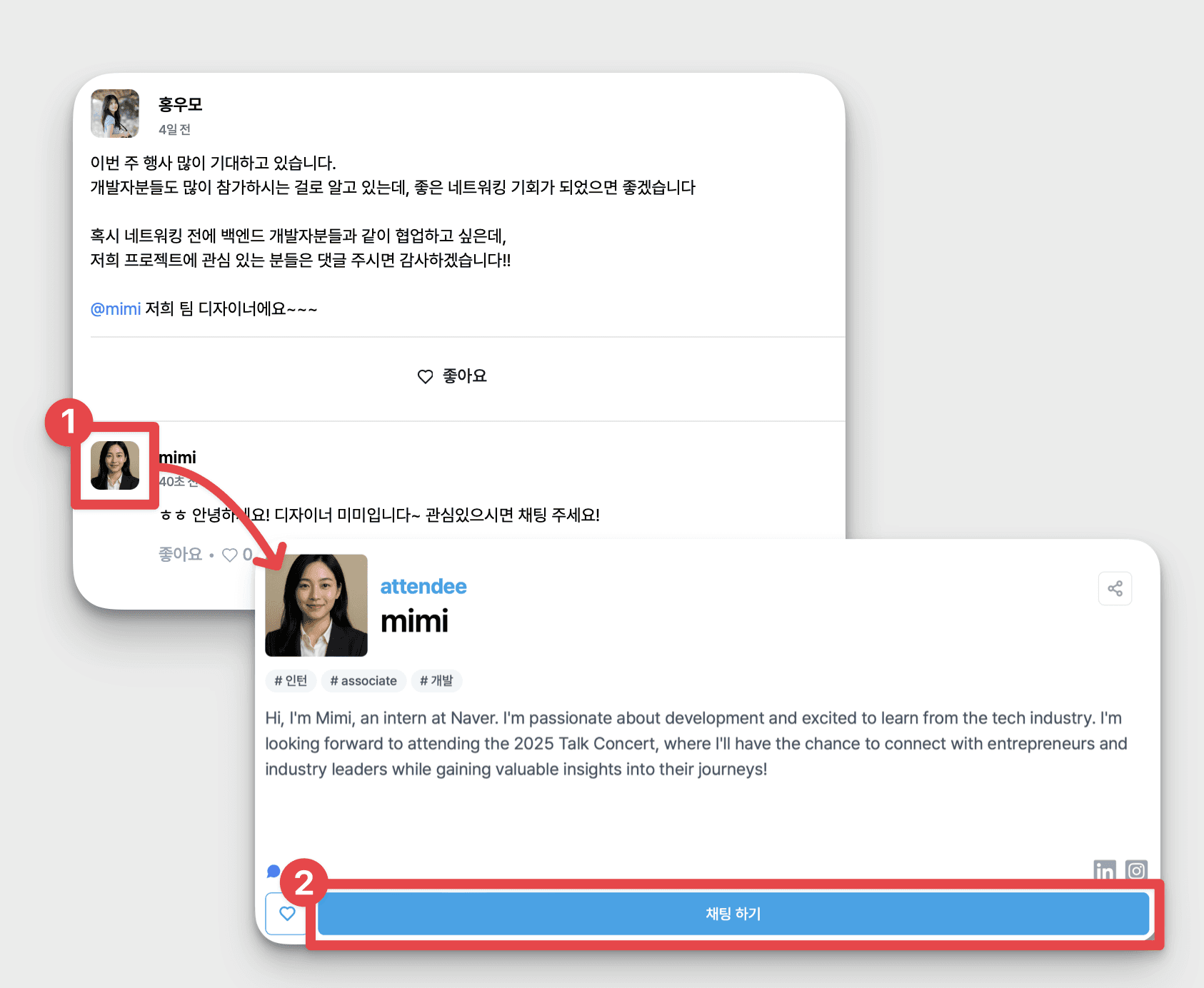 프로필 카드 하단의 [채팅 시작하기] 버튼을 누르면 실시간 채팅이 가능합니다.