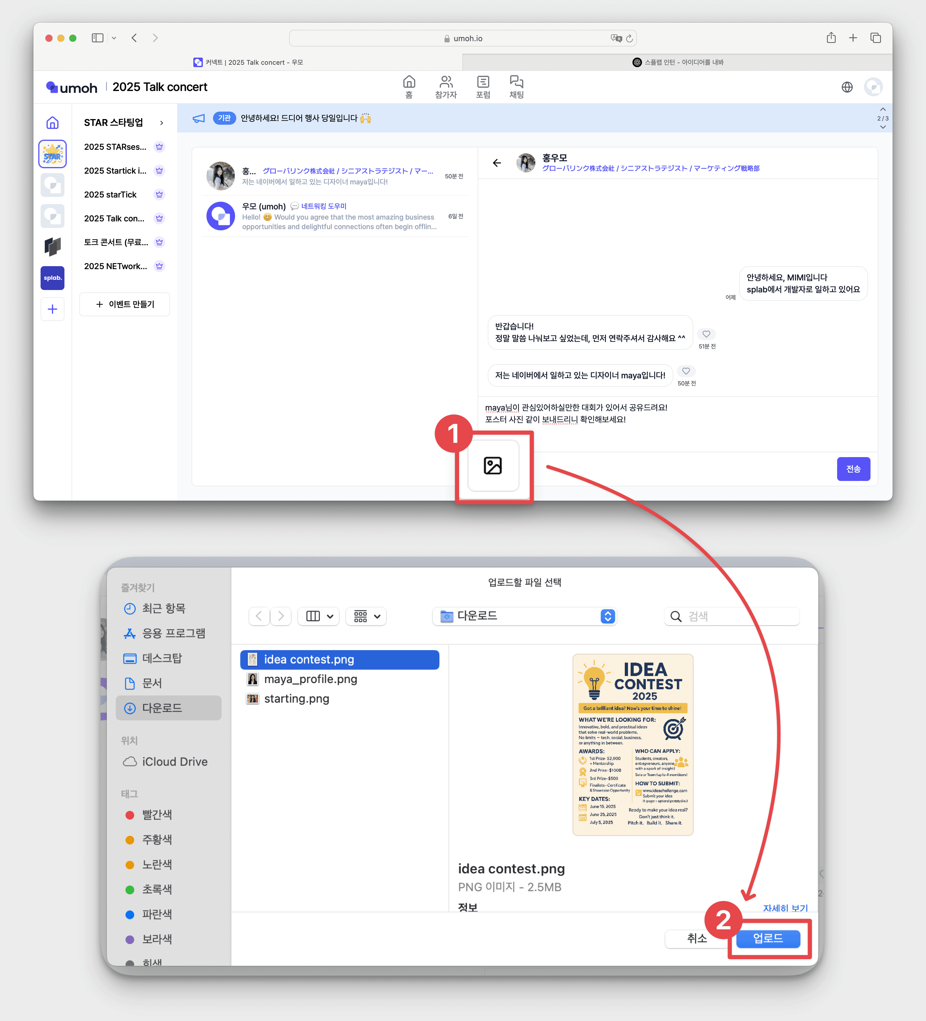 채팅창 하단 [사진 모양 이모티콘] 클릭 → 원하는 사진 선택 → [업로드]