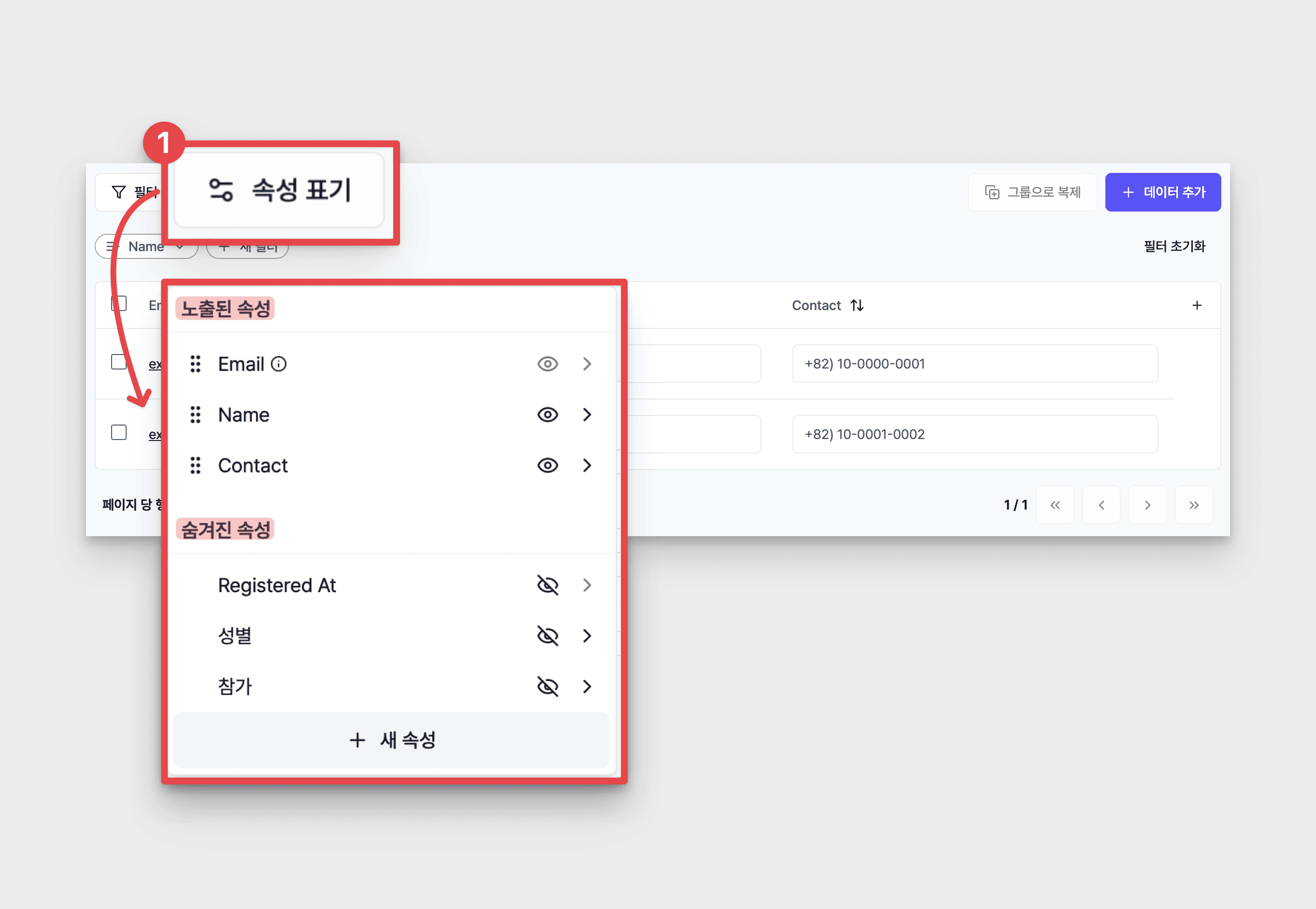 속성 노출/숨김을 통해 필요한 속성만 골라 확인하여 데이터 관리 효율을 높입니다.