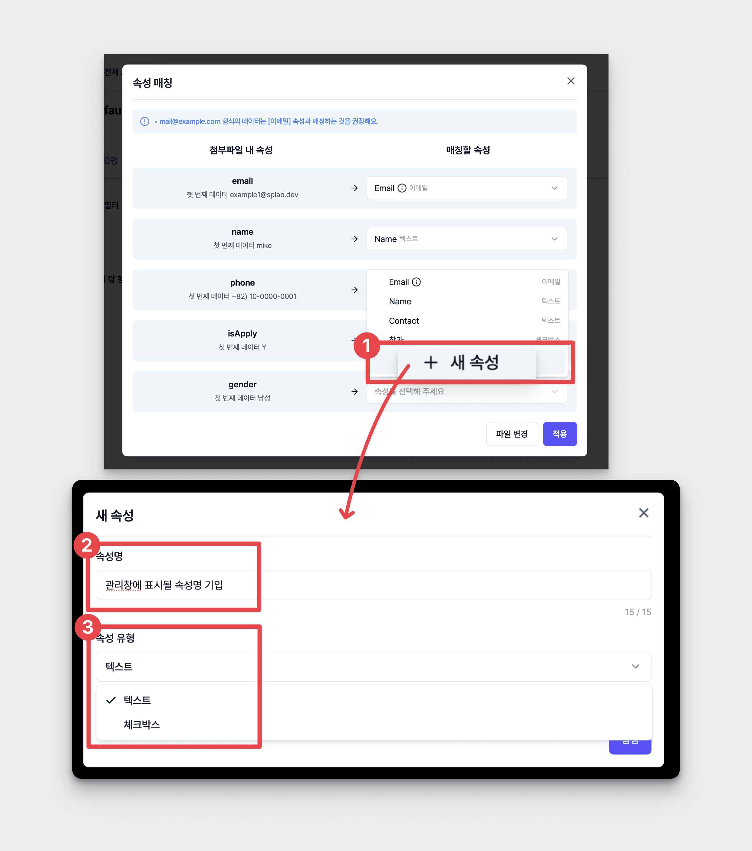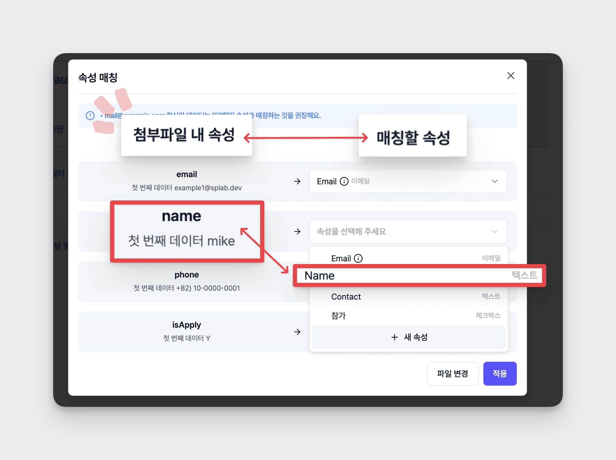 • 우측 [매칭할 속성] 목록의 [속성을 선택해 주세요] 클릭 → 첨부파일 데이터 속성과 매칭되는 [속성] 클릭