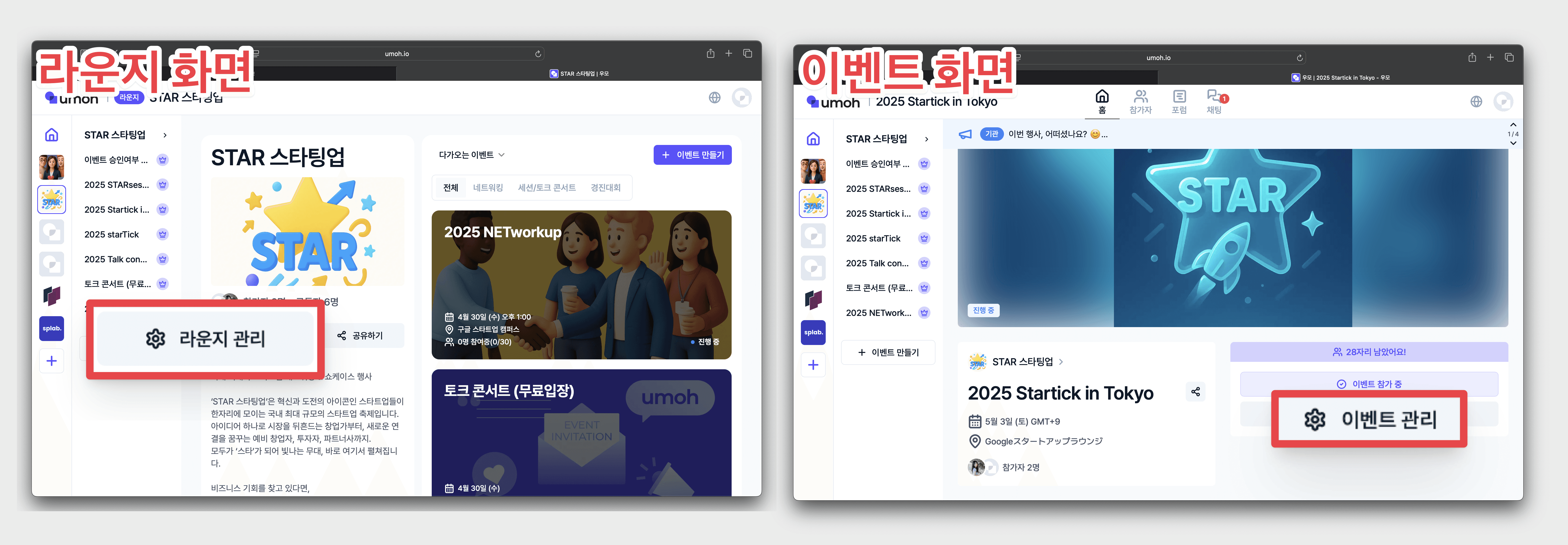 • 라운지 메인화면에서 [라운지 관리] 클릭 또는, 이벤트 메인화면에서 [이벤트 관리] 클릭