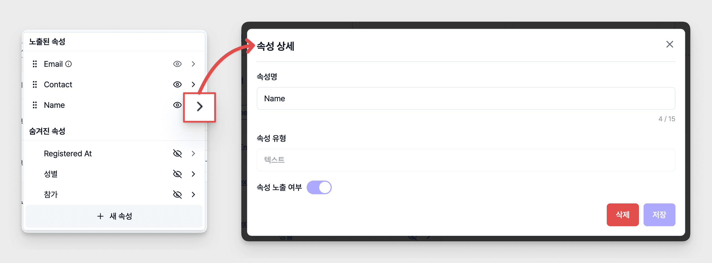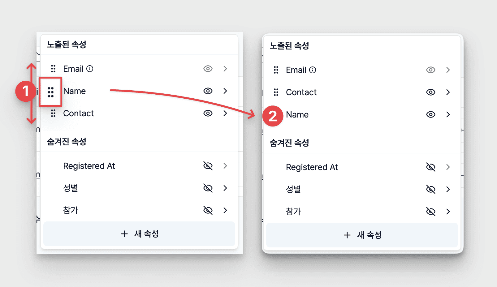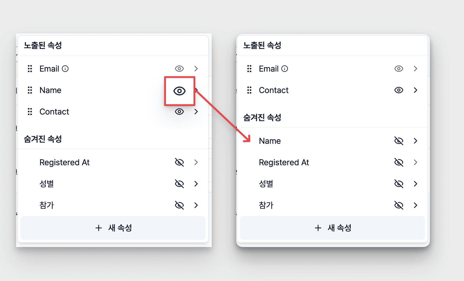 • [노출된 속성] 목록에서 숨기고 싶은 속성 항목의 [👁️] 버튼 클릭 → [숨겨진 속성]으로 이동