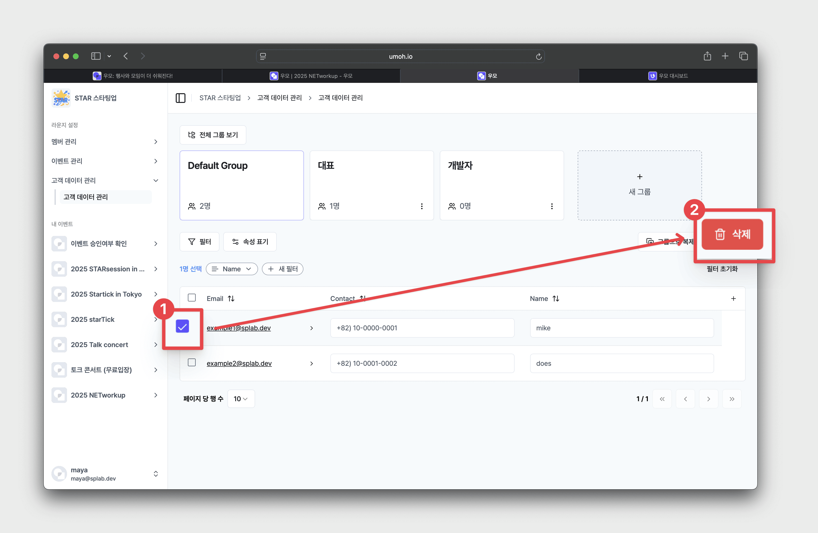• 삭제하고 싶은 고객 데이터 좌측 [체크박스] 클릭 → [삭제] 버튼 클릭
