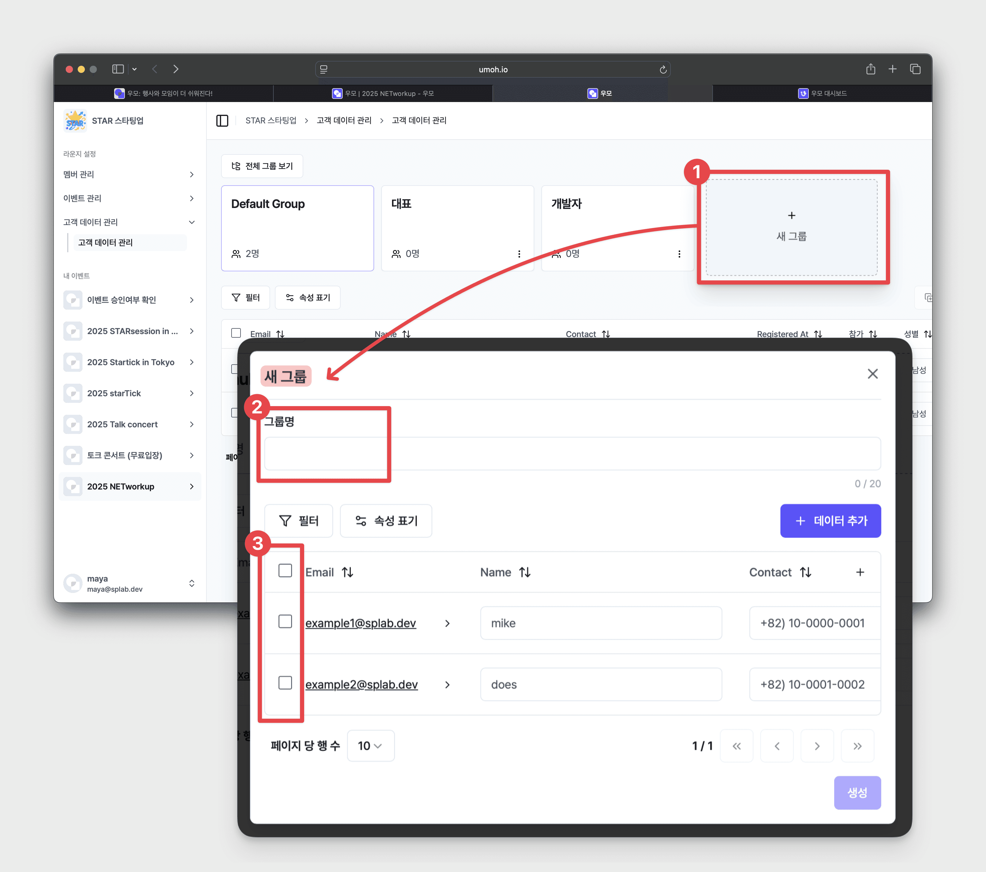 • 고객 데이터 관리 메인화면 상단 [새 그룹] 박스 클릭 → [그룹명] 작성 → 그룹으로 분류하고 싶은 고객 데이터 좌측 [체크박스] 클릭 → [생성] 클릭