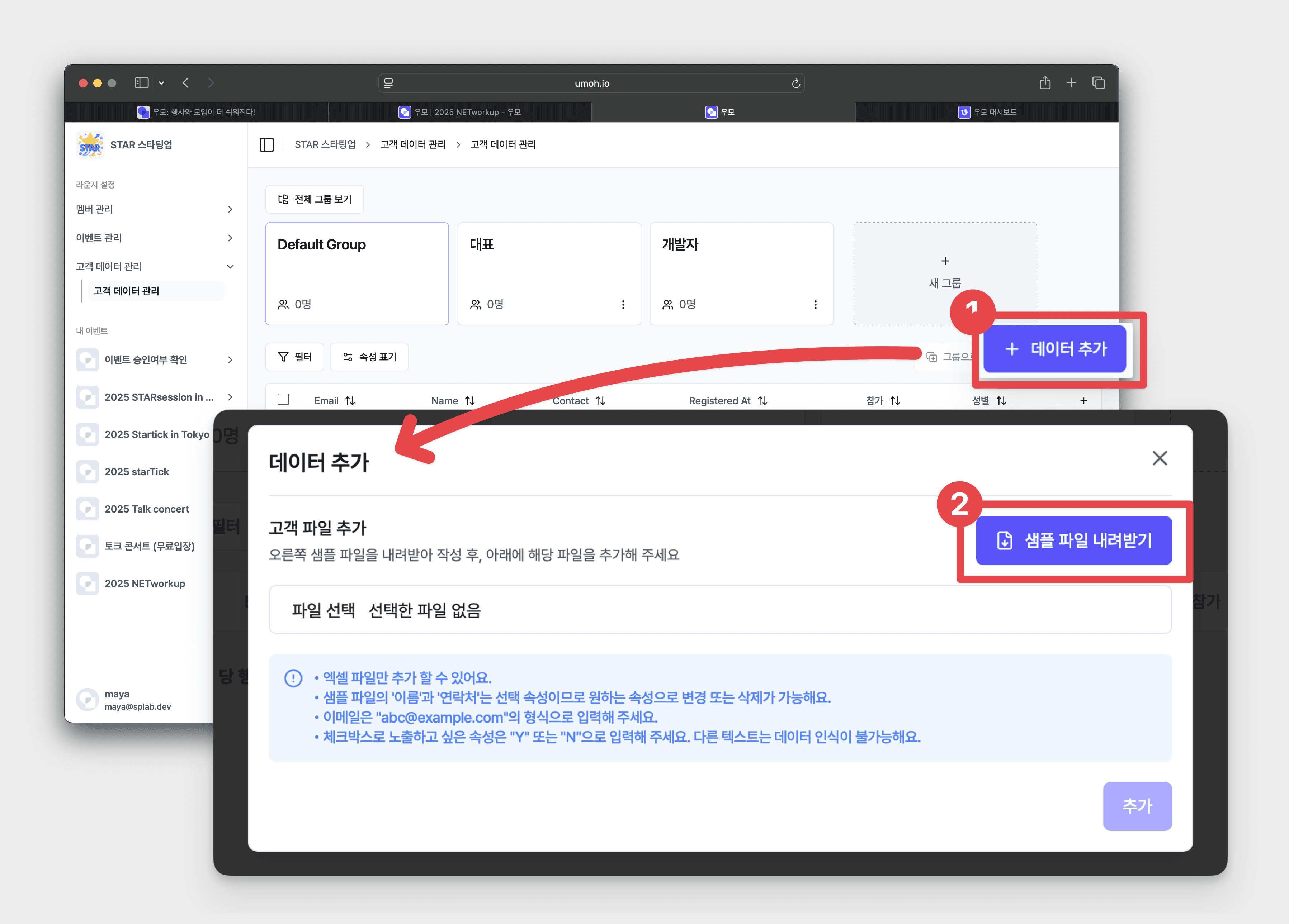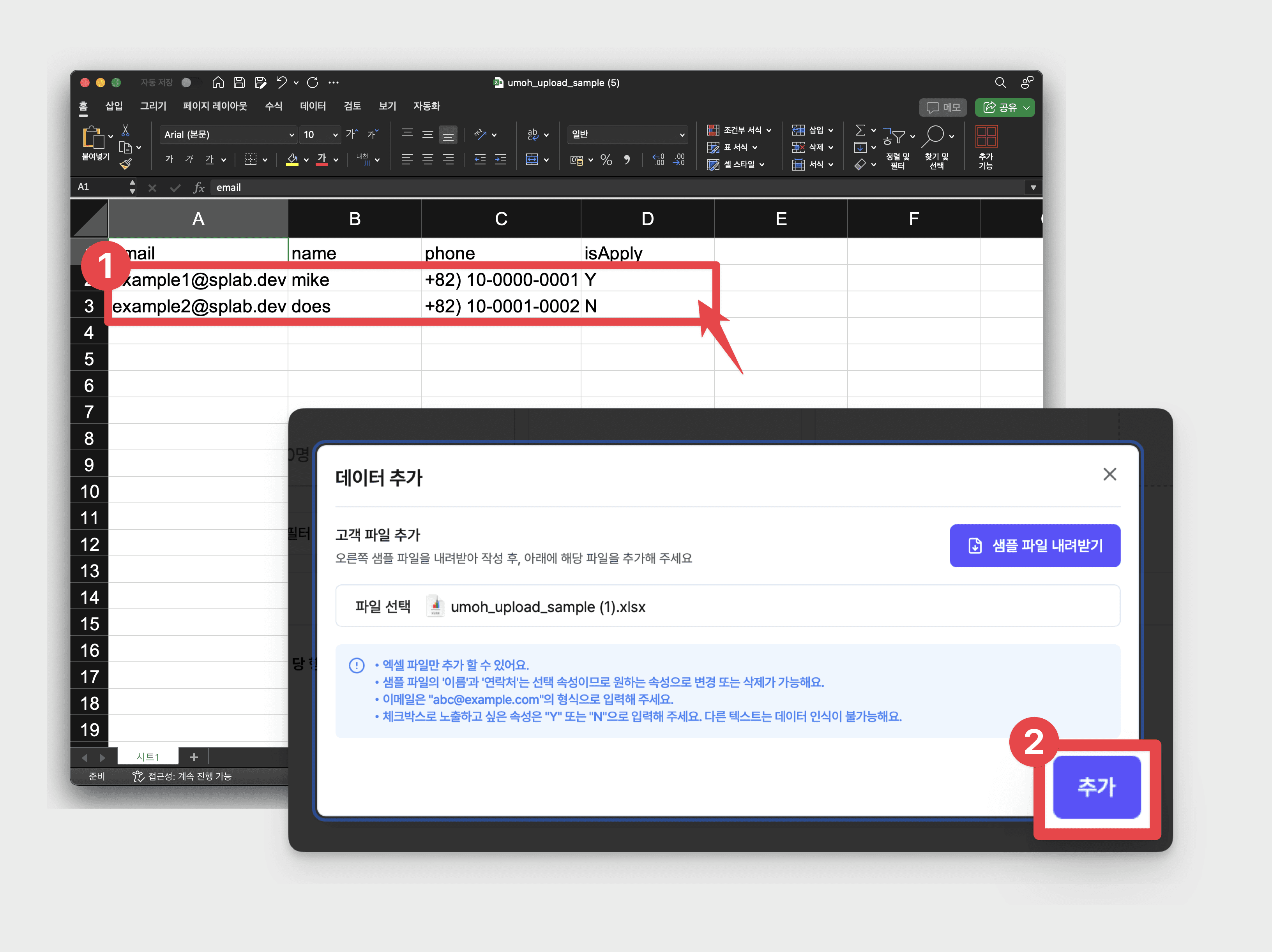 우모에서 제공하는 엑셀 파일을 다운받아 양식에 맞게 고객 데이터를 채워주세요.