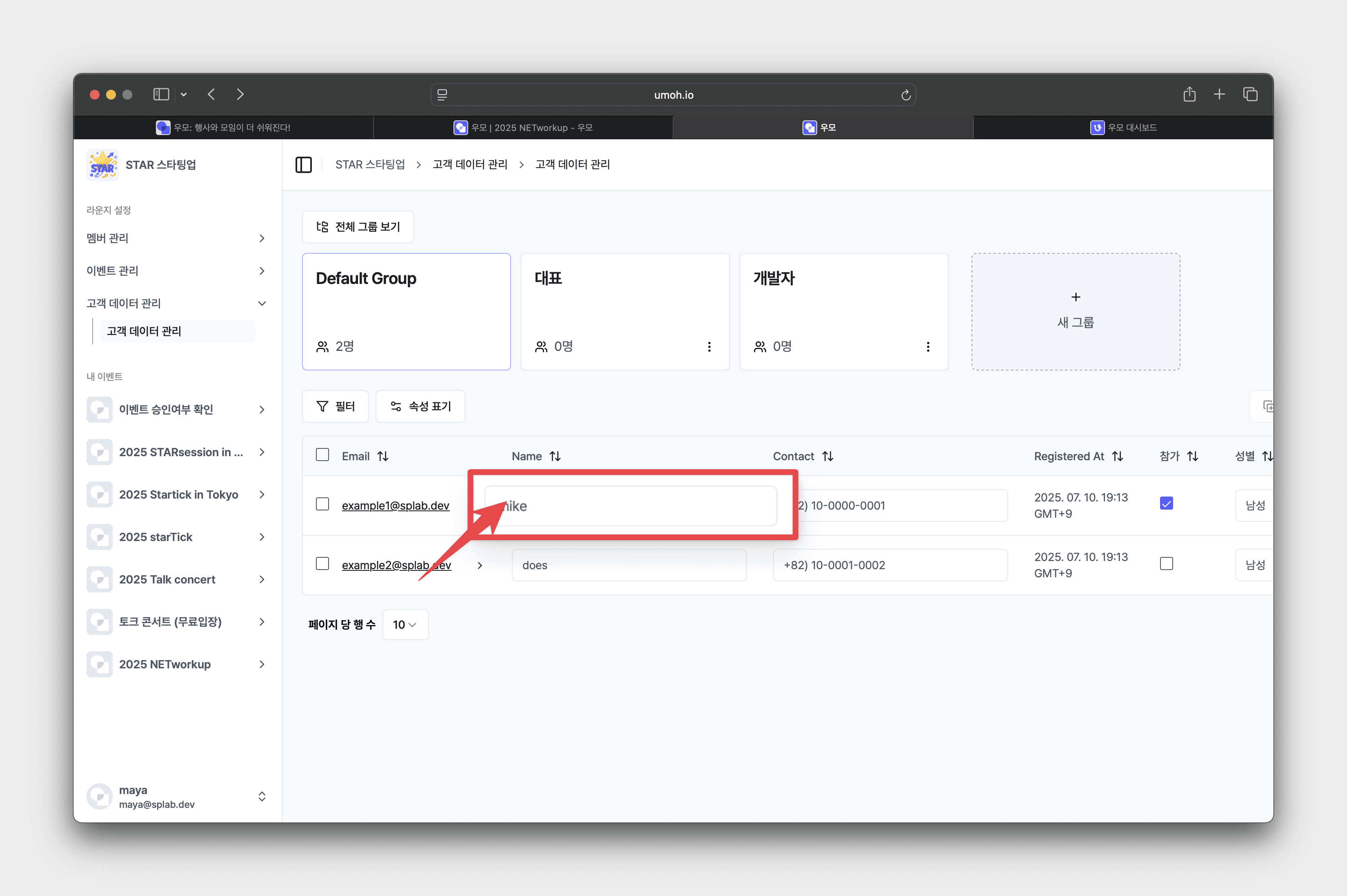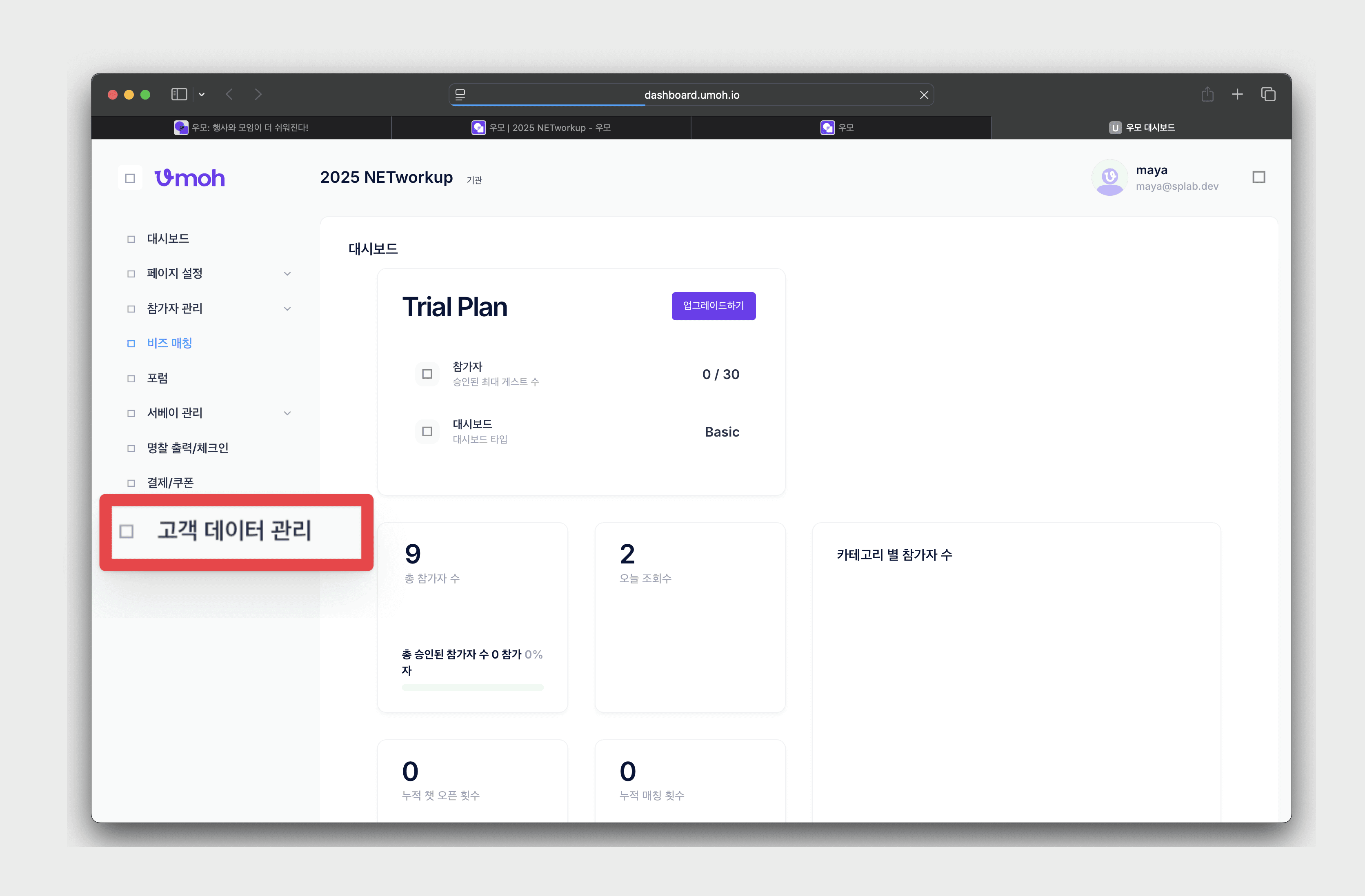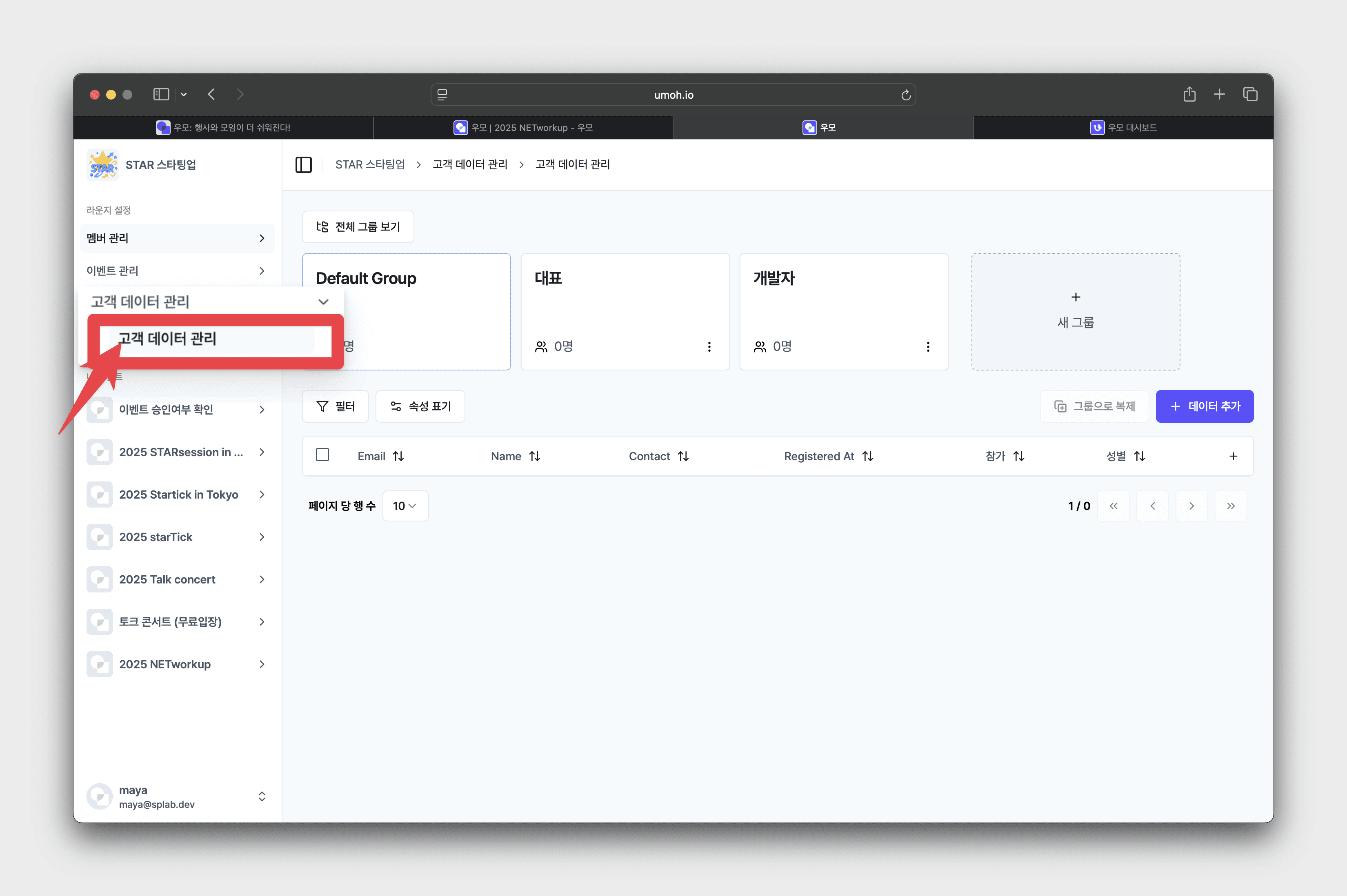 • 이벤트 관리 대시보드 좌측 [고객 데이터 관리] 클릭 → 고객 데이터 관리창으로 이동