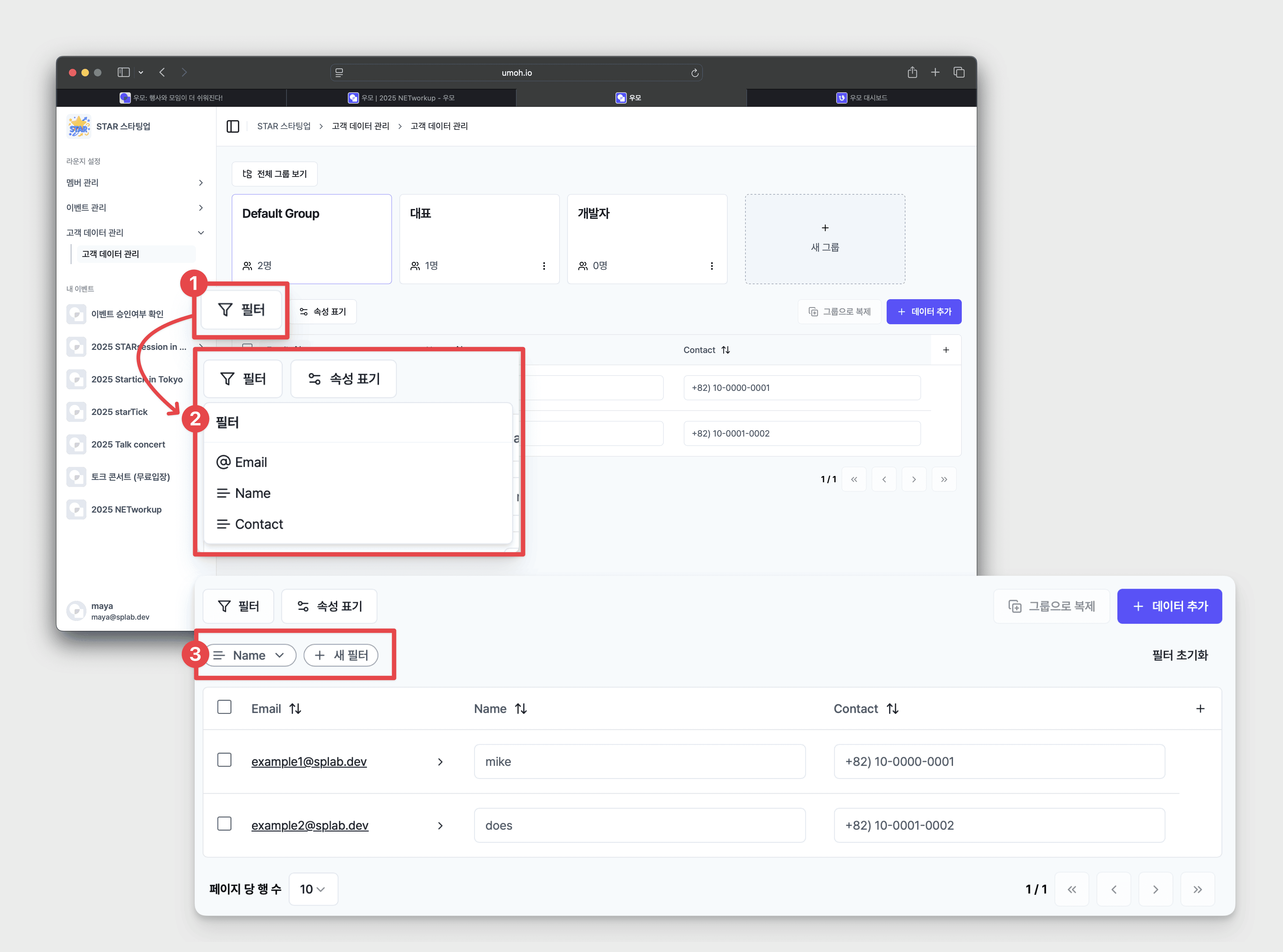 [필터], [속성 표기]를 통해 고객 데이터를 효율적으로 확인할 수 있습니다.