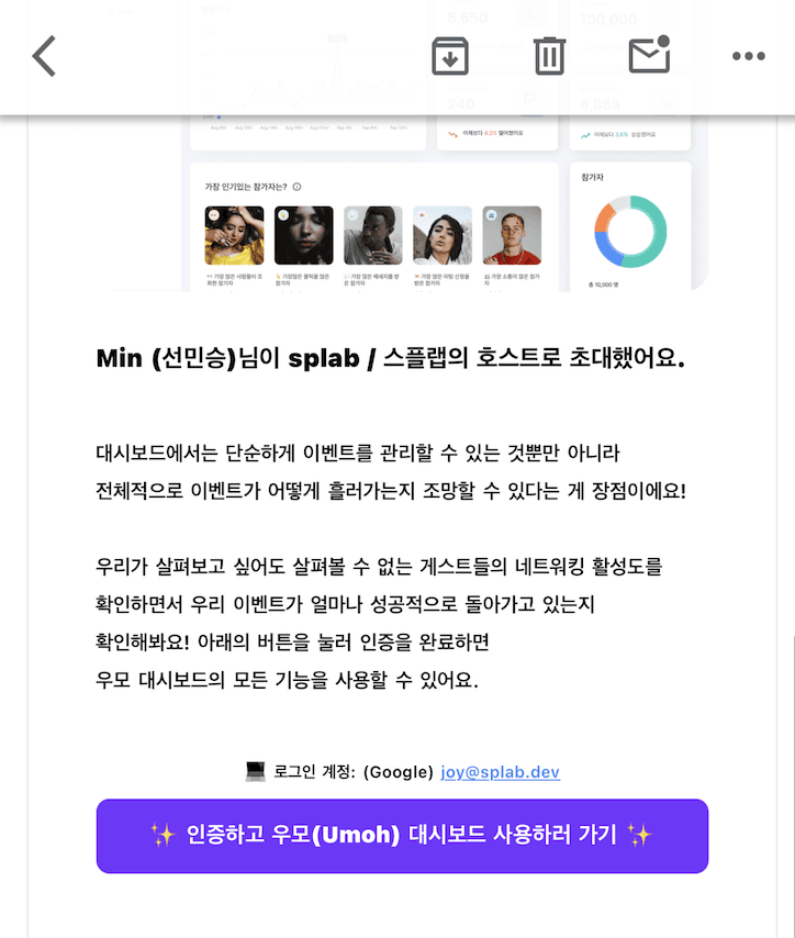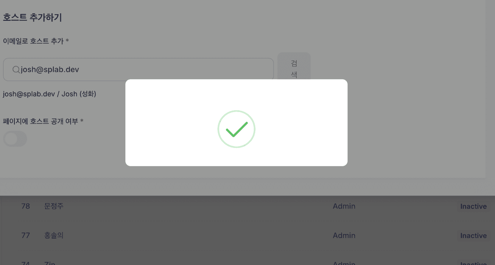 6. '검색' 버튼을 누르면 '해당 이메일이 우모 유저인지 확인'한 후, 맞다면 '체크' 표시가 뜹니다.