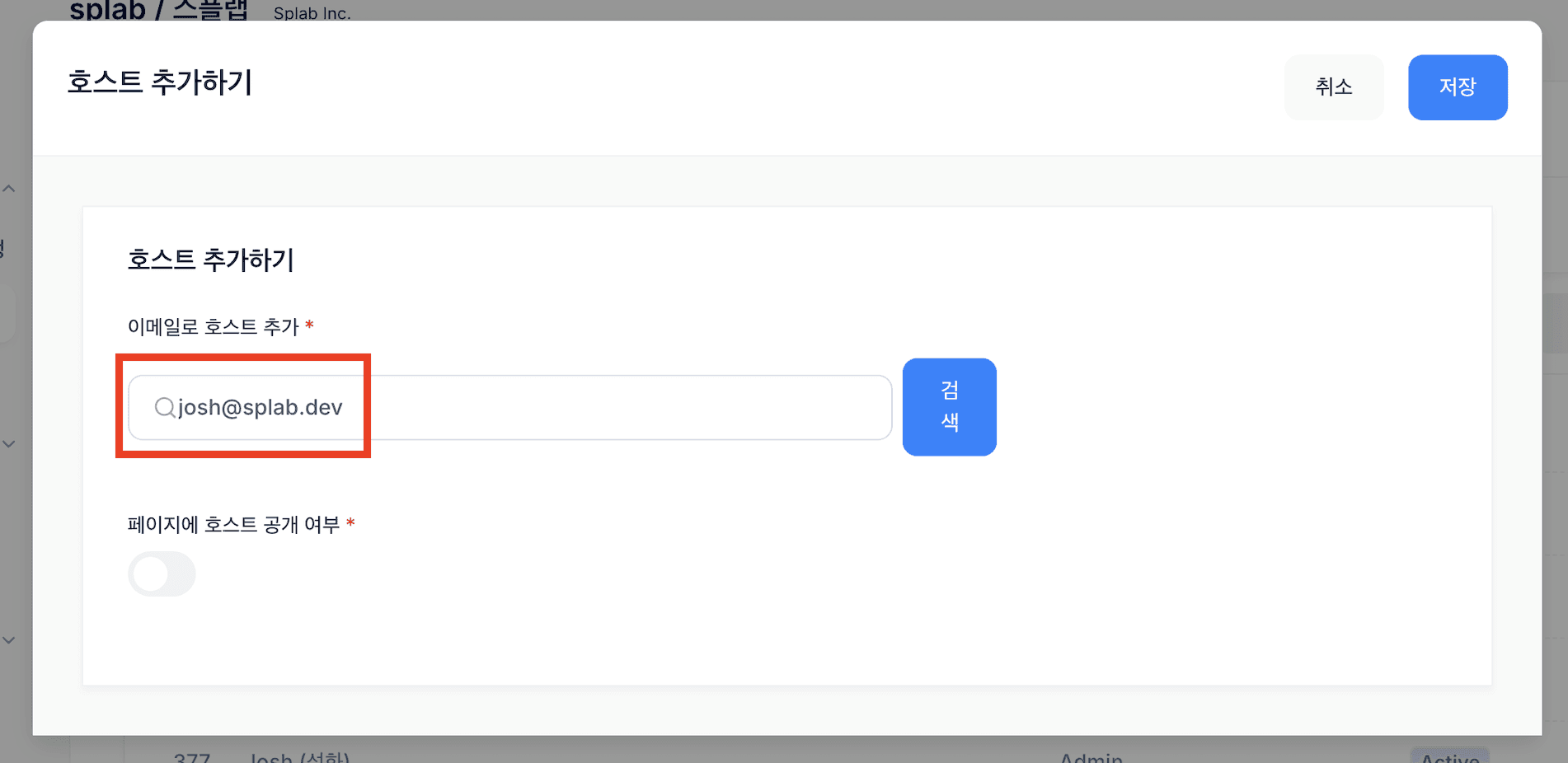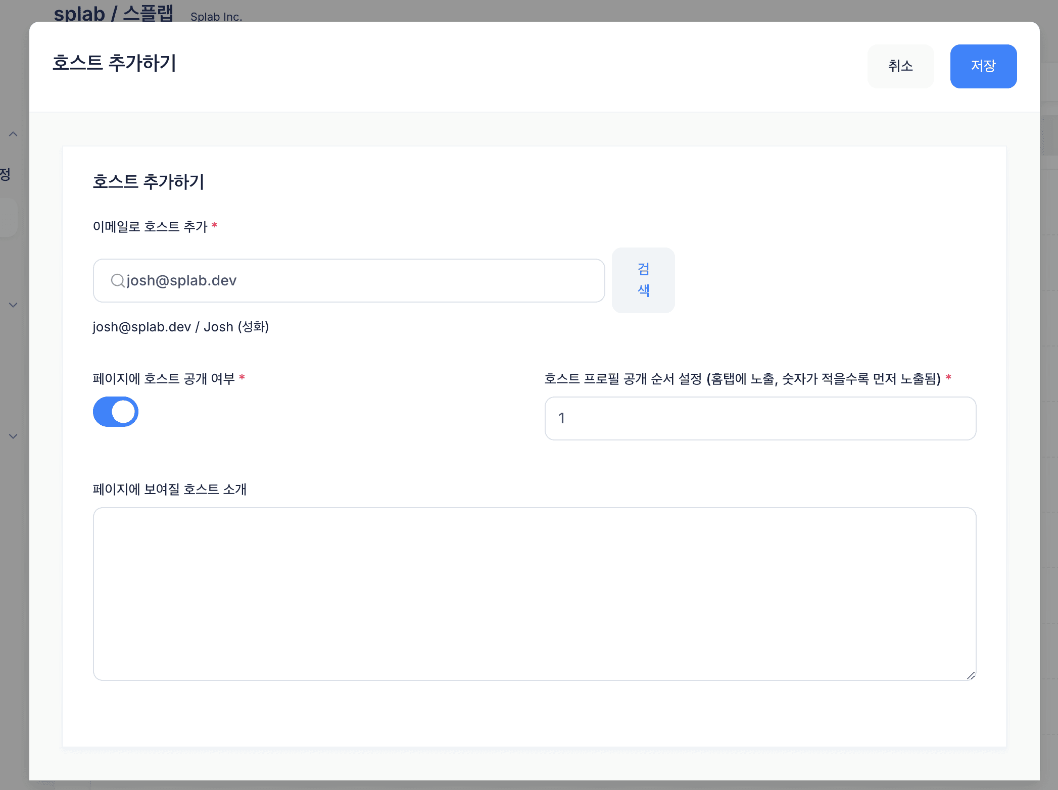 7. 해당 호스트가 이벤트 페이지에서 노출되었으면 하시면, '페이지에 호스트 공개 여부' 체크를 ON 해주시고 노출된 호스트의 소개글도 작성해주시면 됩니다.