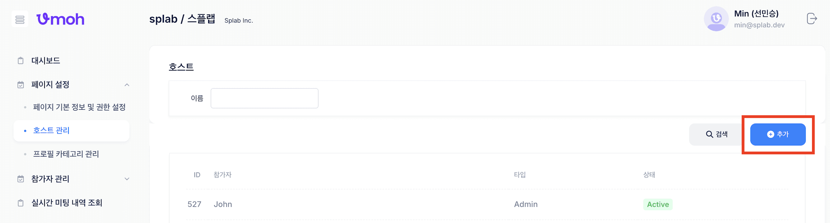 4. 호스트 관리 페이지에서 '추가' 버튼을 눌러주세요