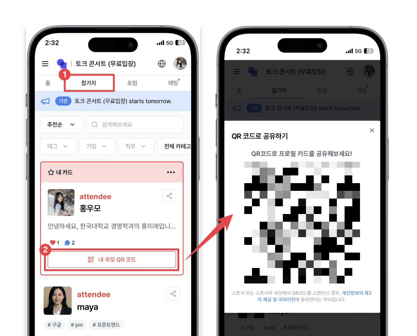 [참가자] 클릭 → 내 카드 하단 [내 우모 QR 코드] → [QR 코드]창 팝업 열림