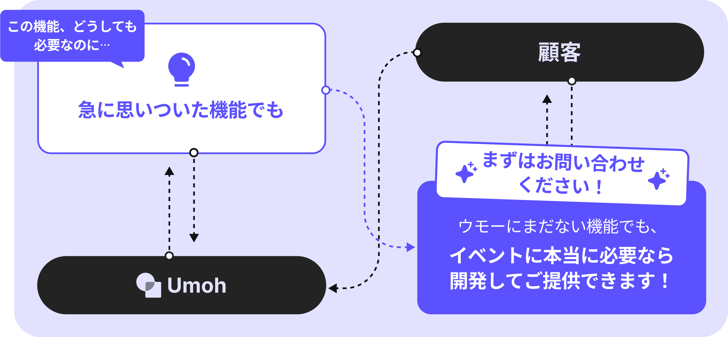 企画者が通知を送る一方向のコミュニケーションも必要ですが、 参加者同士の討議や1対1チャットなど状況に応じた異なるコミュニケーションチャネルが必要であり、 レポート目的の会話記録も重要です。