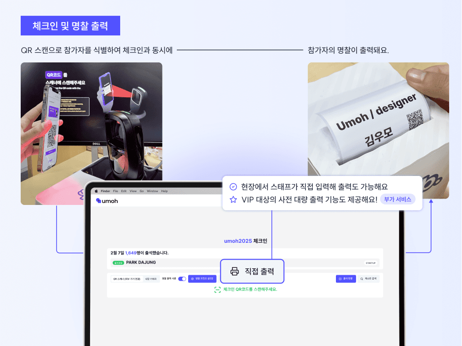 우모(Umoh)와 같은 QR 체크인 시스템을 도입하면, 참가자는 사전에 QR 코드를 발급받아 행사장에서 간단한 스캔만으로 출입할 수 있습니다. 이를 통해 인력 절감, 명찰 제작 비용 절감, 출입 관리의 편의성 향상이라는 세 마리 토끼를 잡을 수 있습니다.