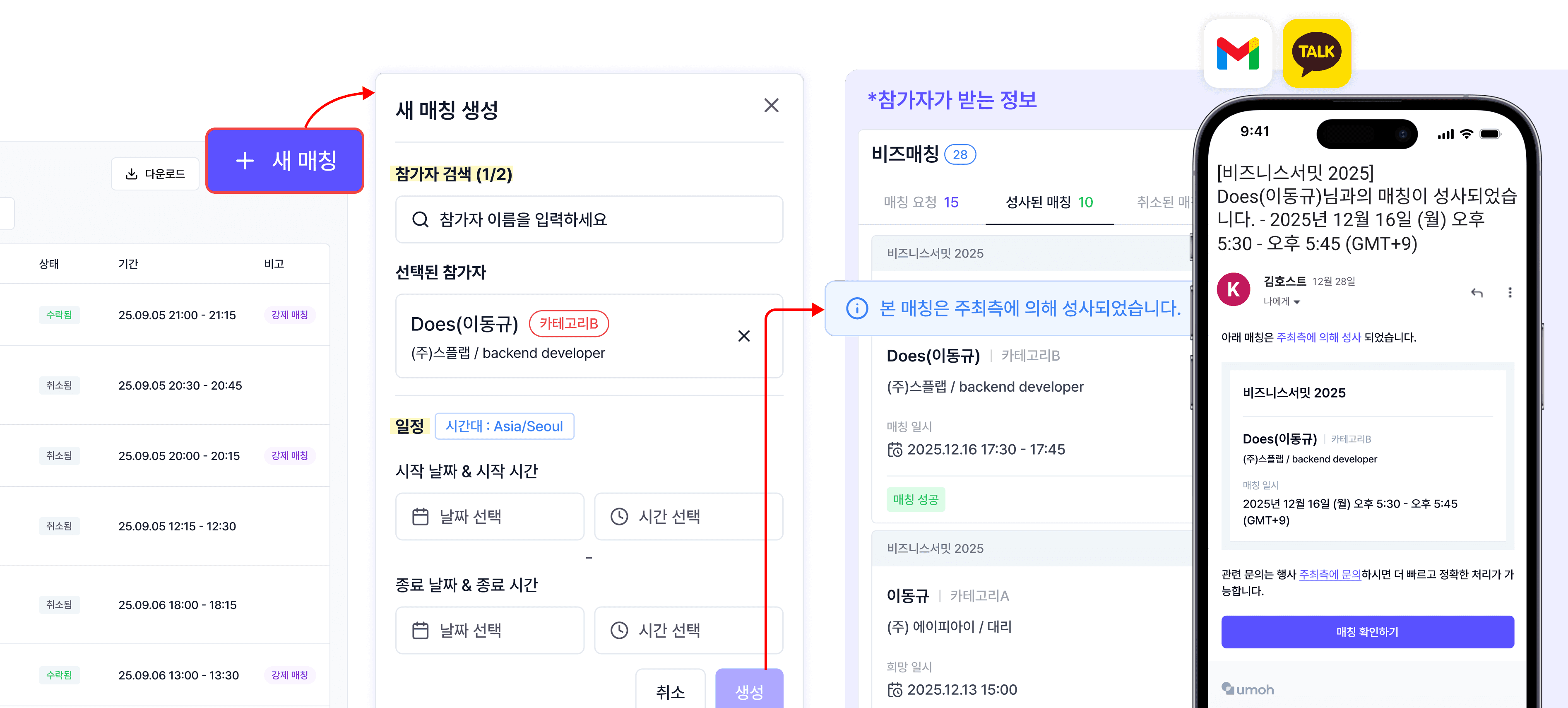 미팅 일시를 설정하고 [생성]을 클릭하면, 해당되는 참가자에게 매칭이 성사되었다는 알림이 발송됩니다.