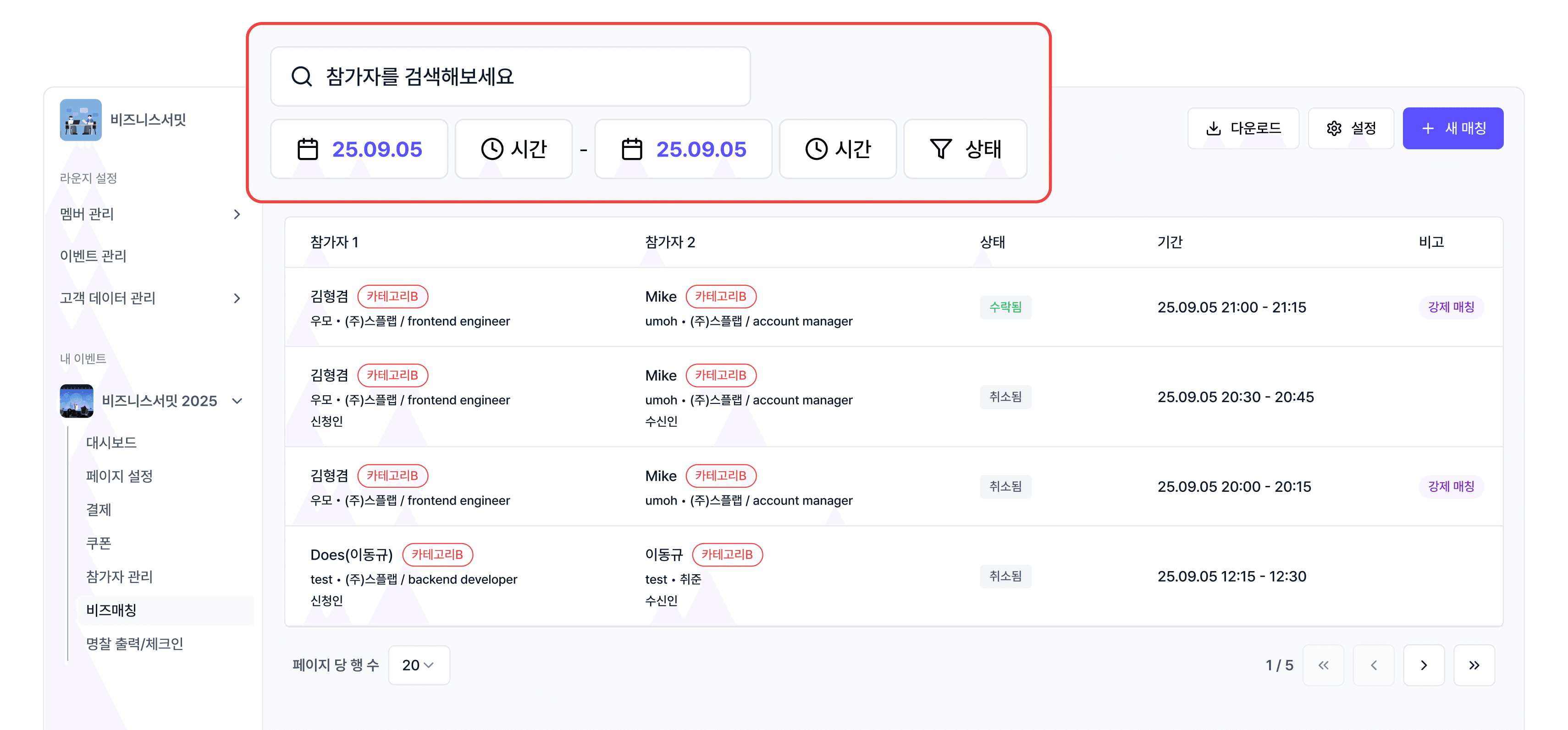 이벤트 관리 페이지의 [비즈매칭] 탭에서 관리하고 있는 이벤트의 모든 매칭 현황을 확인해 보세요.