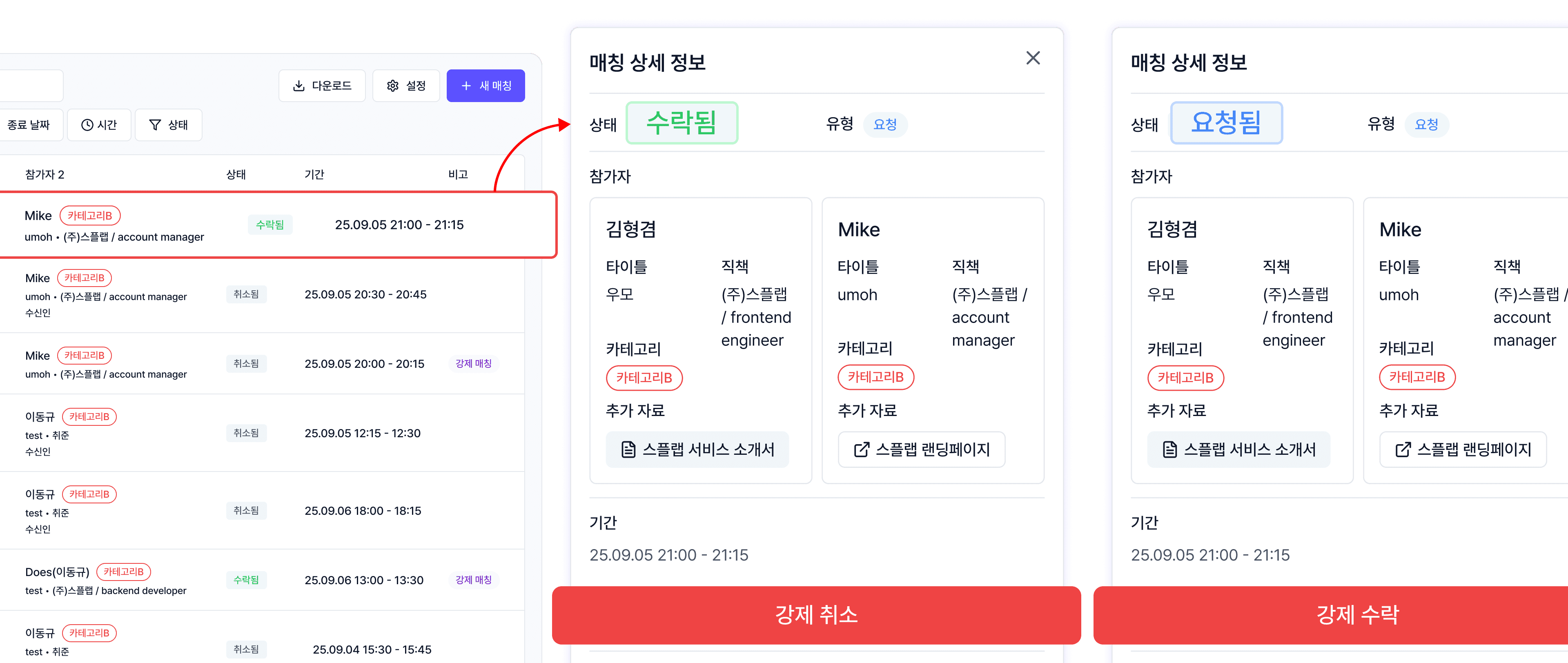 특정 매칭을 클릭하면 상세 정보를 확인할 수 있고, 관리자 권한으로 수락된 매칭을 강제로 취소하거나 수락 대기중인 매칭을 강제로 수락할 수 있어요.