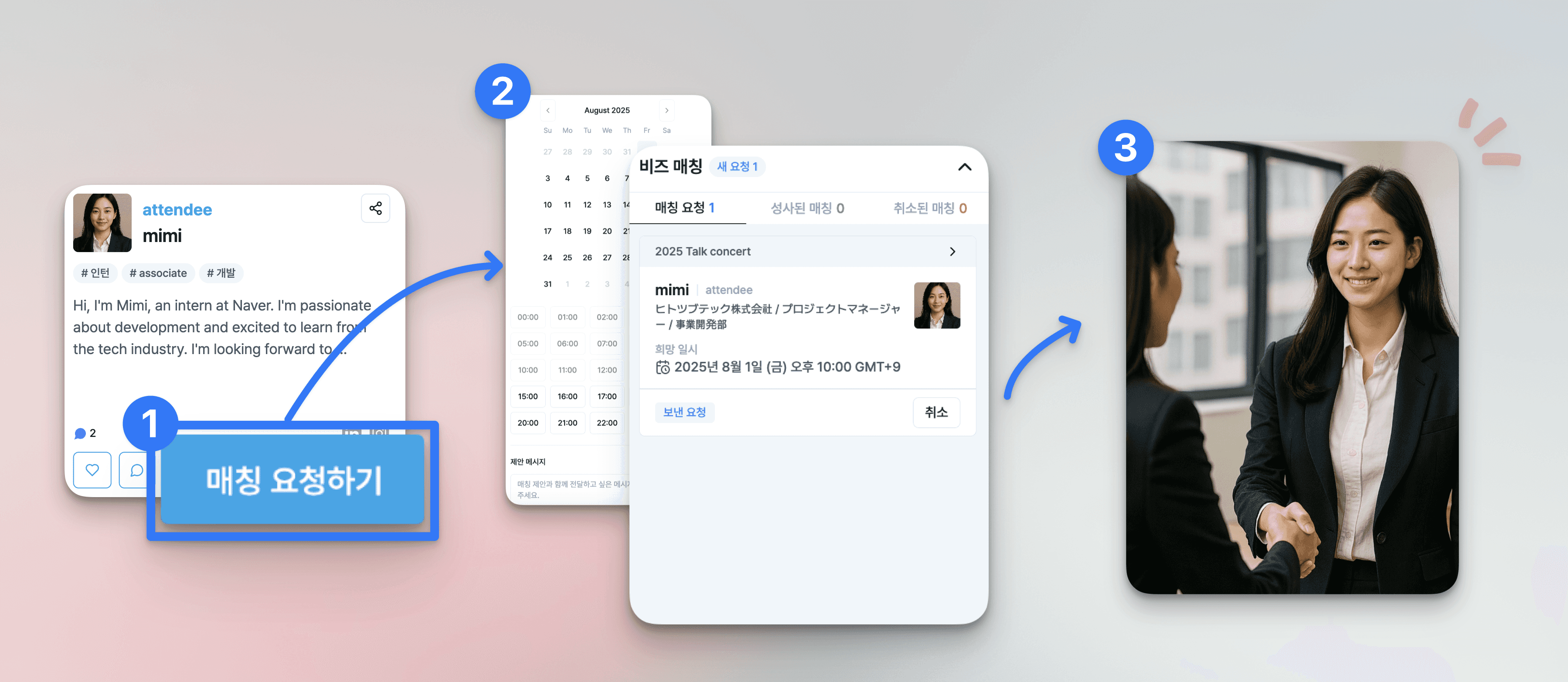 참가자는 상대방의 가능 시간대를 확인하고, 간단한 메시지와 함께 미팅을 요청할 수 있어요.