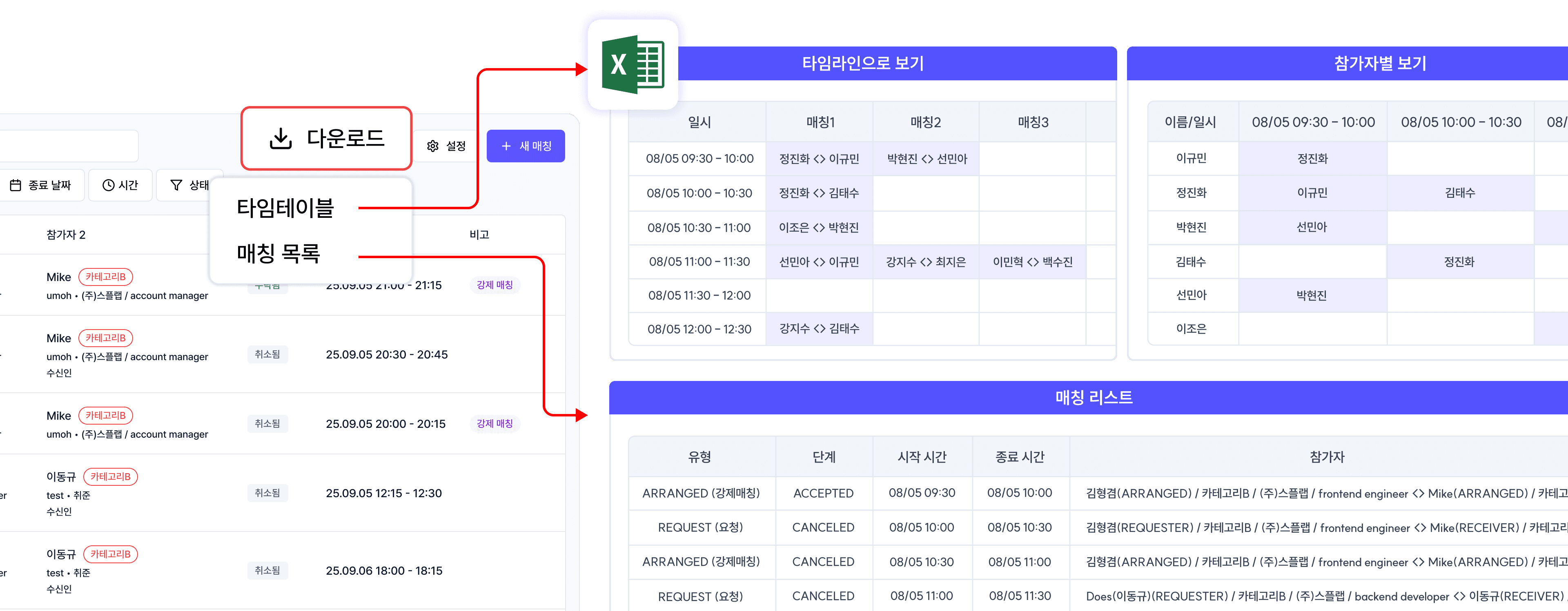 [↓ 다운로드]를 클릭하면, 원하는 형식으로 매칭 목록을 엑셀(.xlsx) 파일로 저장할 수 있어요.