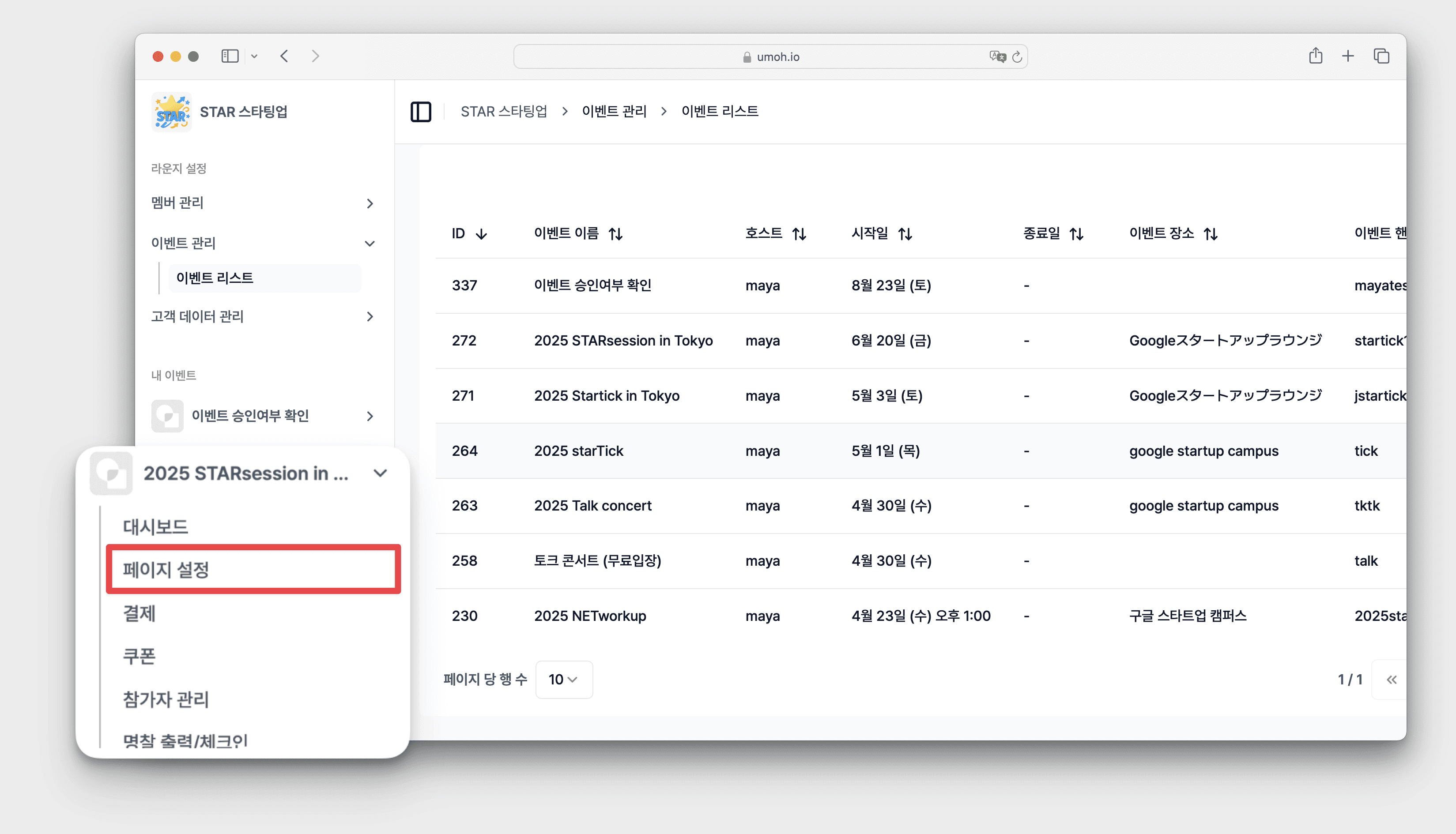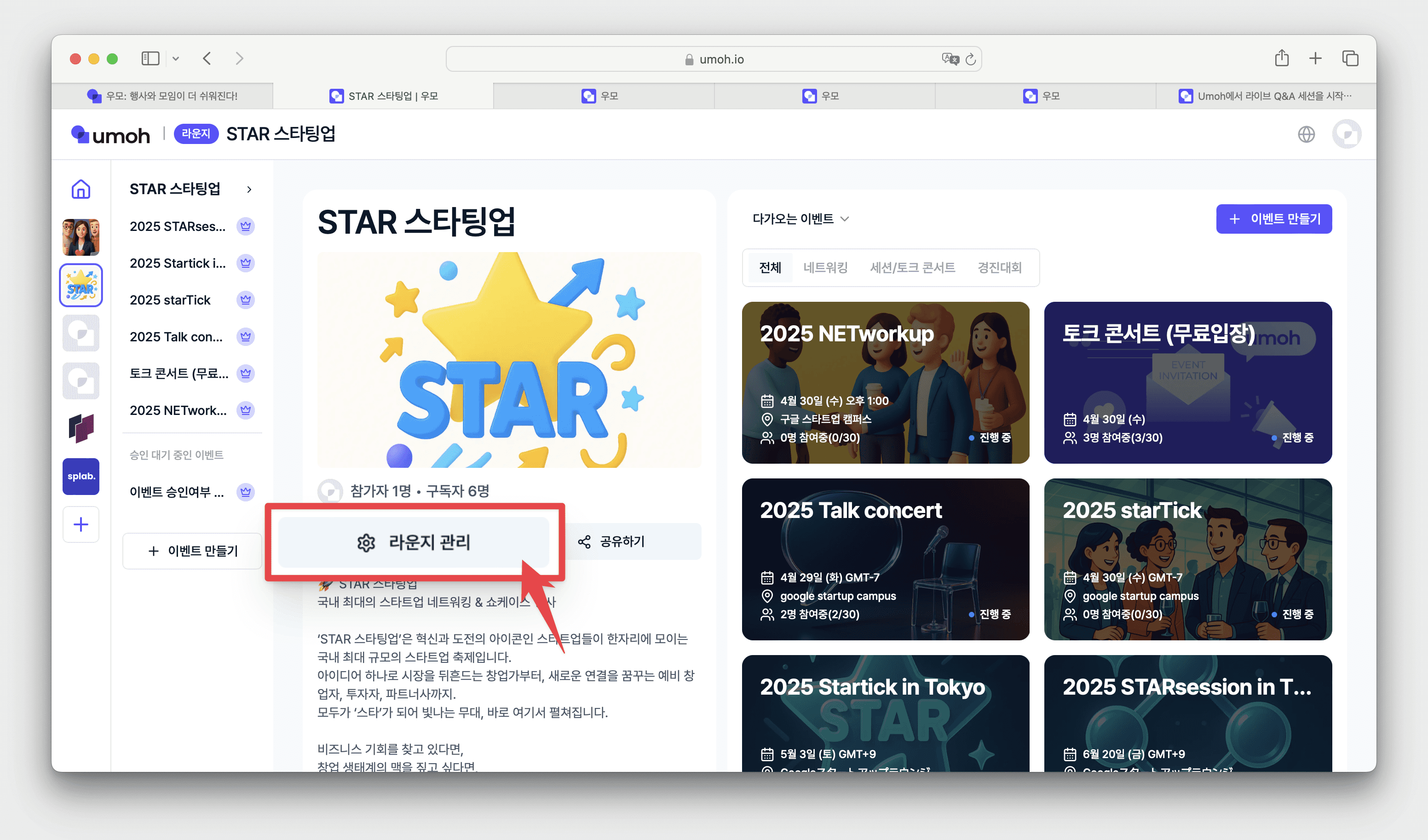 • 라운지 관리 대시보드 좌측 [내 이벤트] 확인 → 이벤트 [페이지 설정] 클릭
