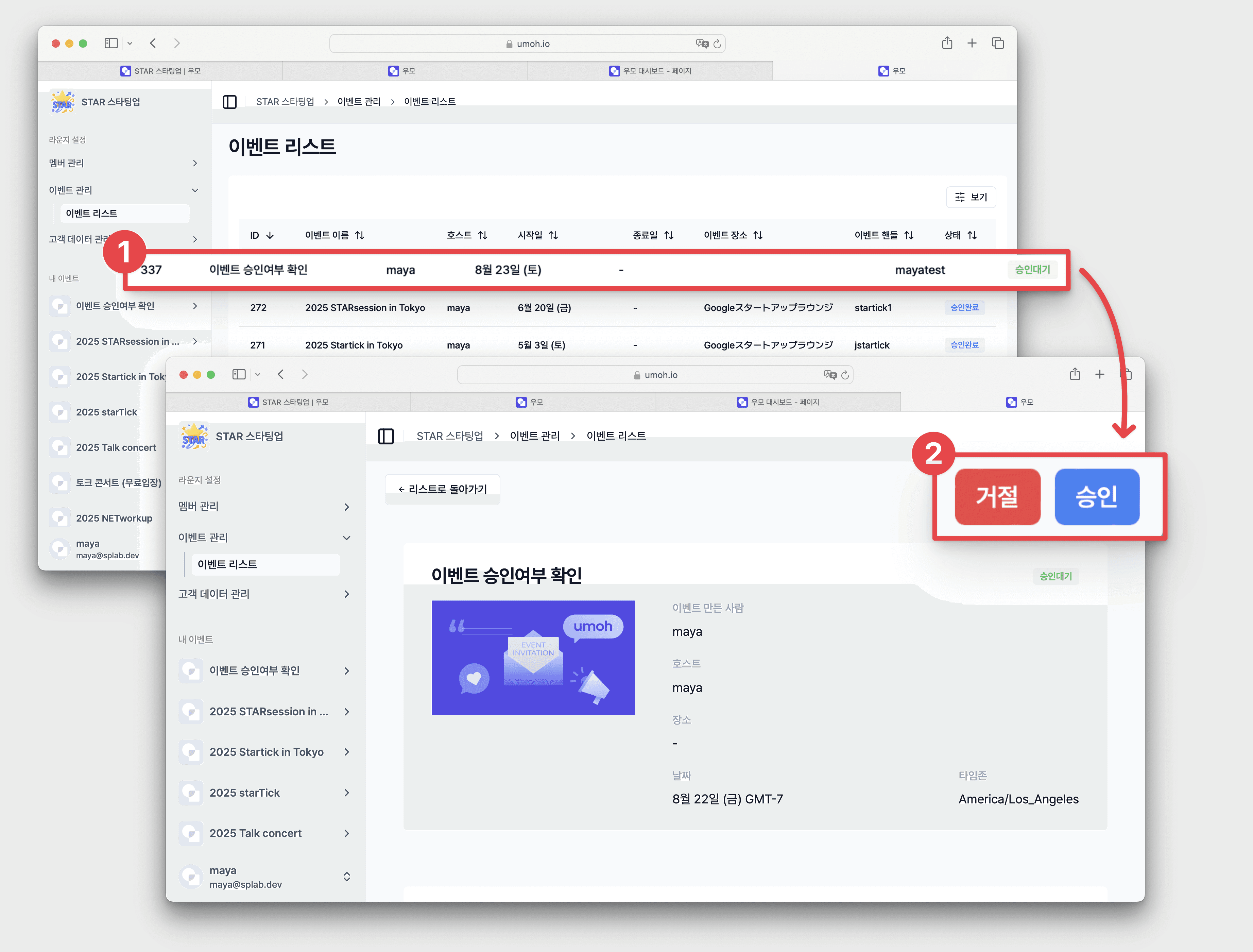 • [승인 대기 이벤트] 클릭 → [거절/승인] 클릭