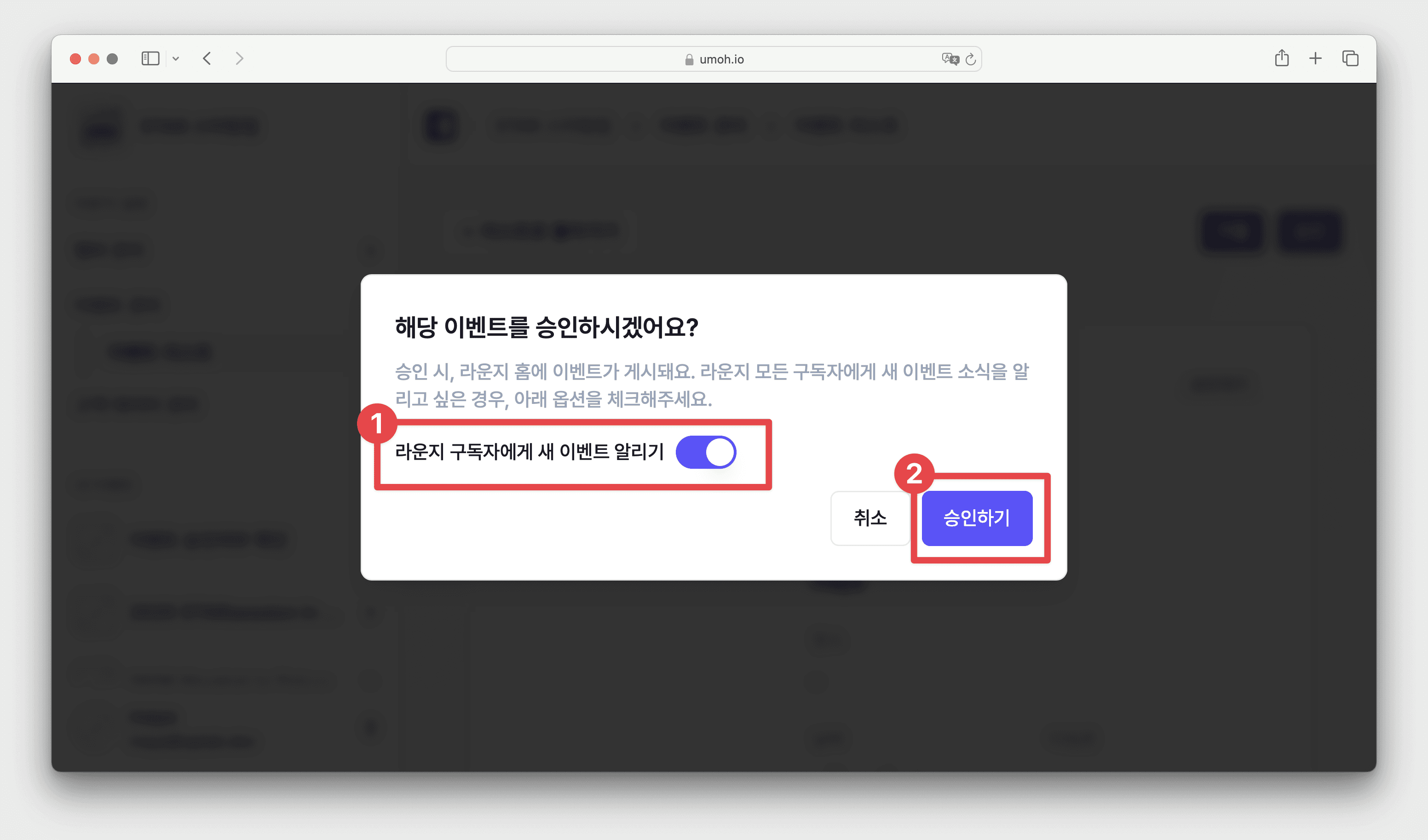 • '라운지 구독자에게 새 이벤트 알리기' 문구 오른쪽 [스위치] 클릭 → [승인하기] 클릭
