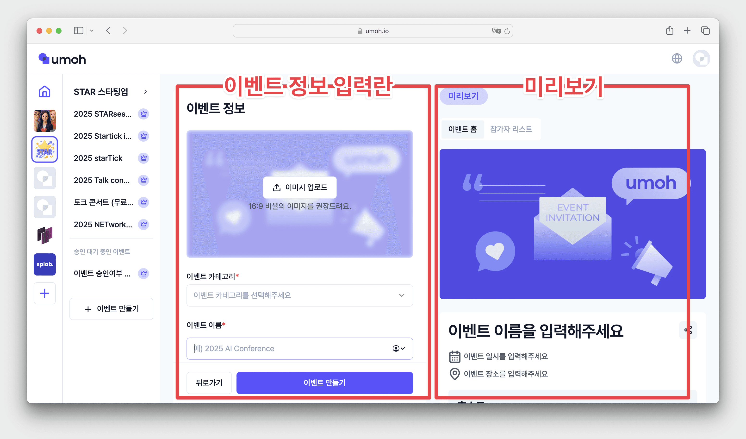 이벤트 정보를 입력하면 우측에서 실시간 미리보기를 확인할 수 있어요.
