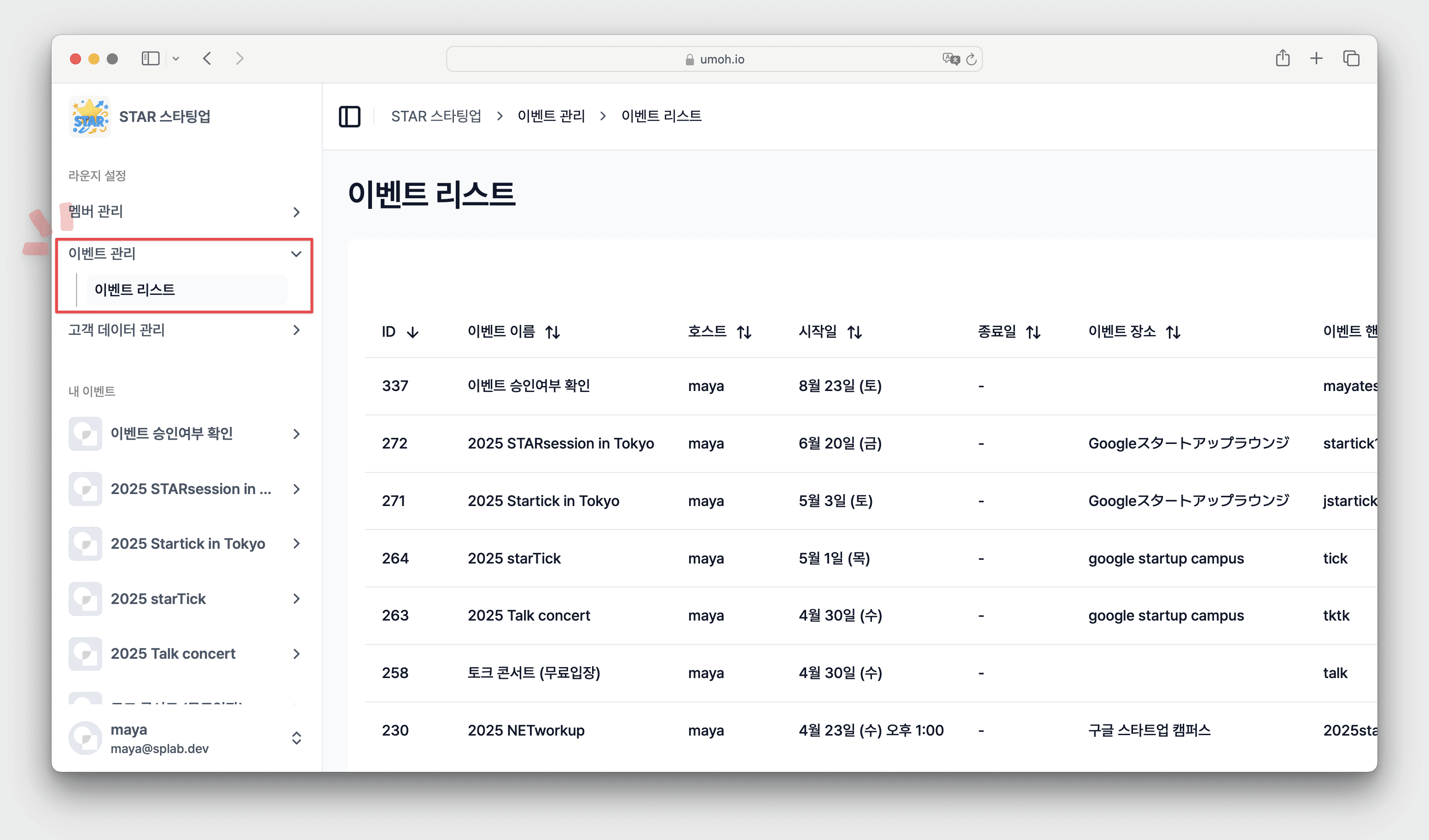 • 라운지 관리 대시보드 좌측 사이드바 [이벤트 리스트] 클릭