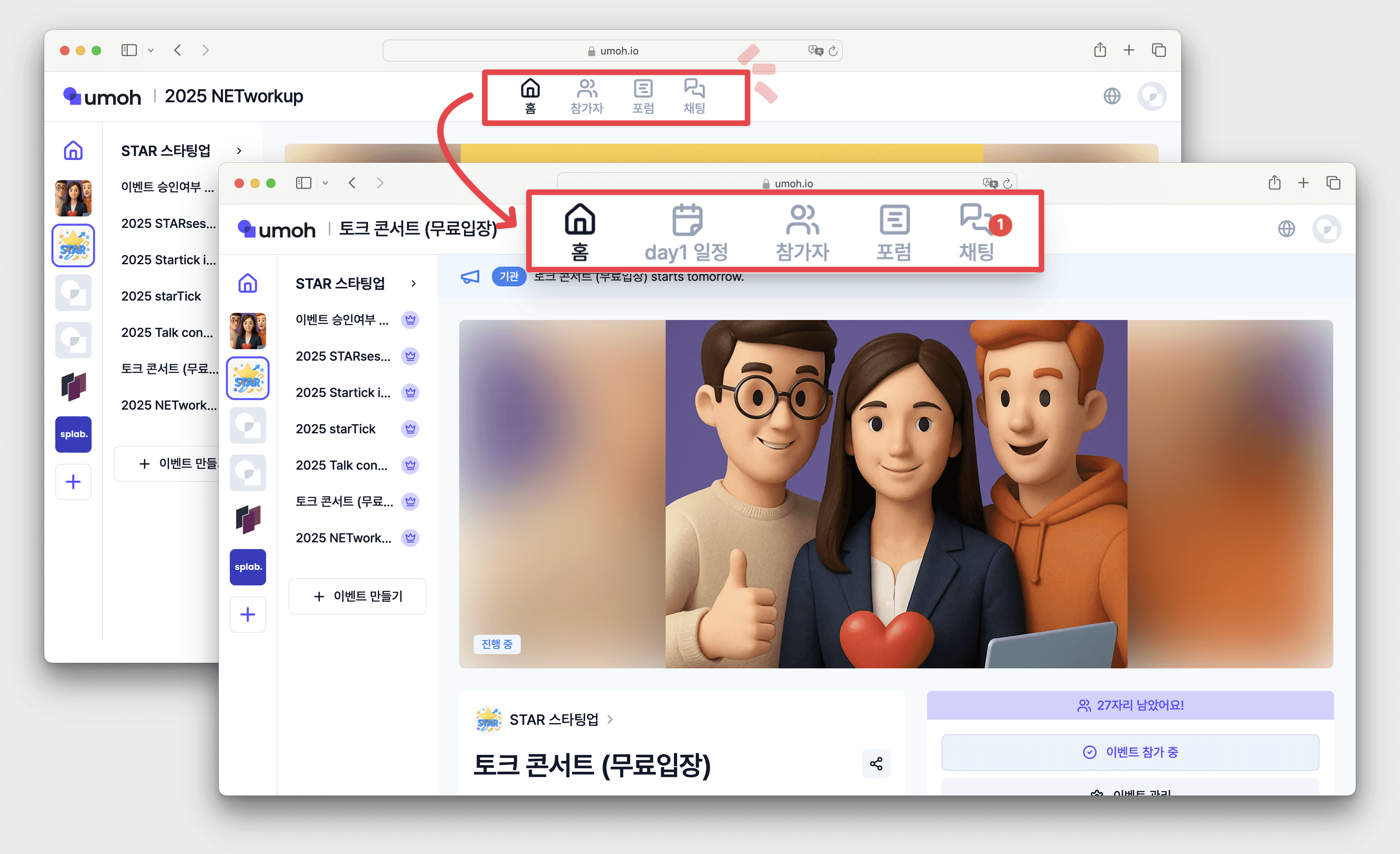 이벤트 상단 탭은 기본적으로 홈 / 참가자 / 포럼 / 채팅으로 구성되어 있으며,