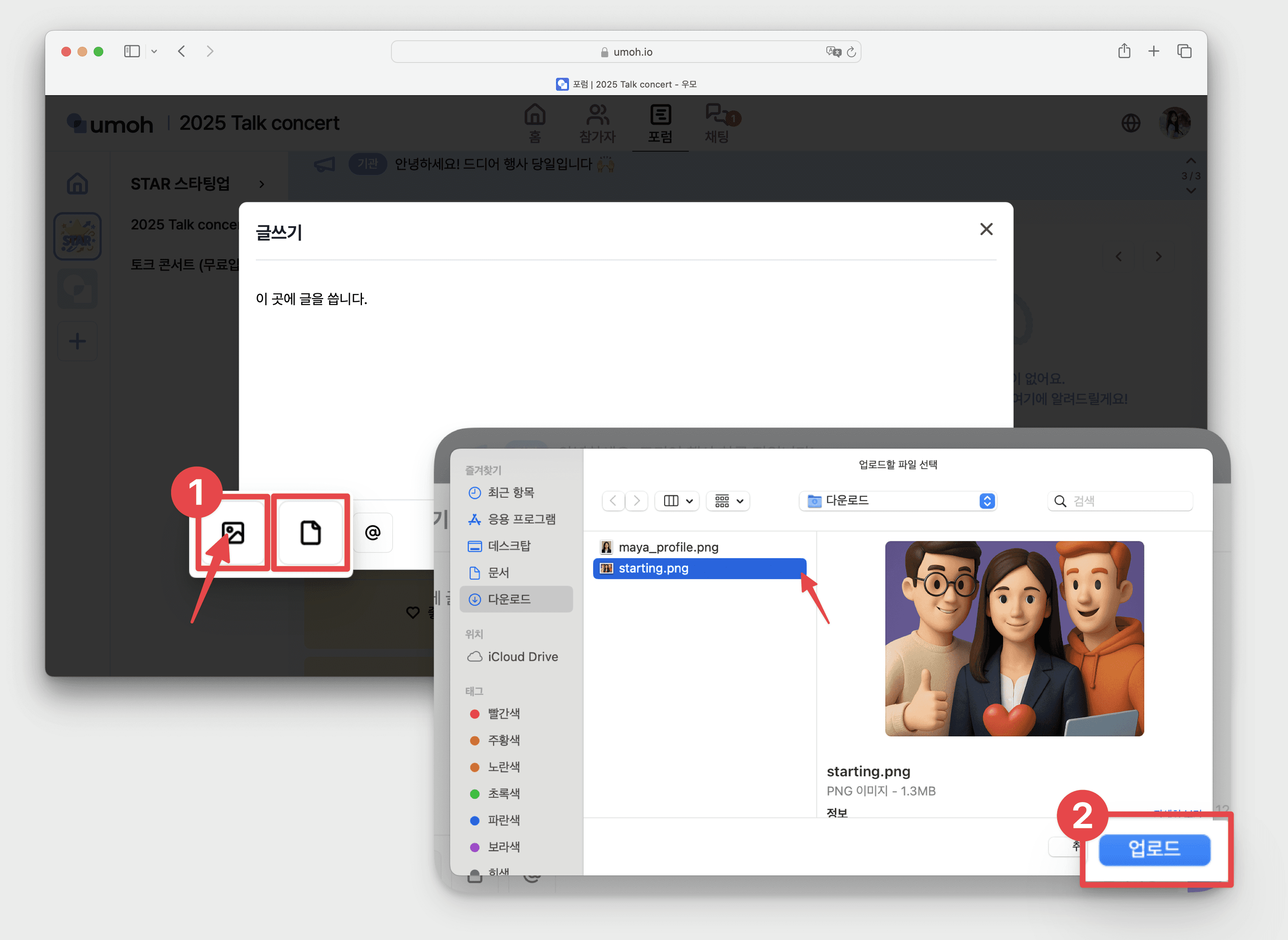 [이미지], [파일] 아이콘 선택 → 원하는 사진/파일 클릭 후 [업로드]
