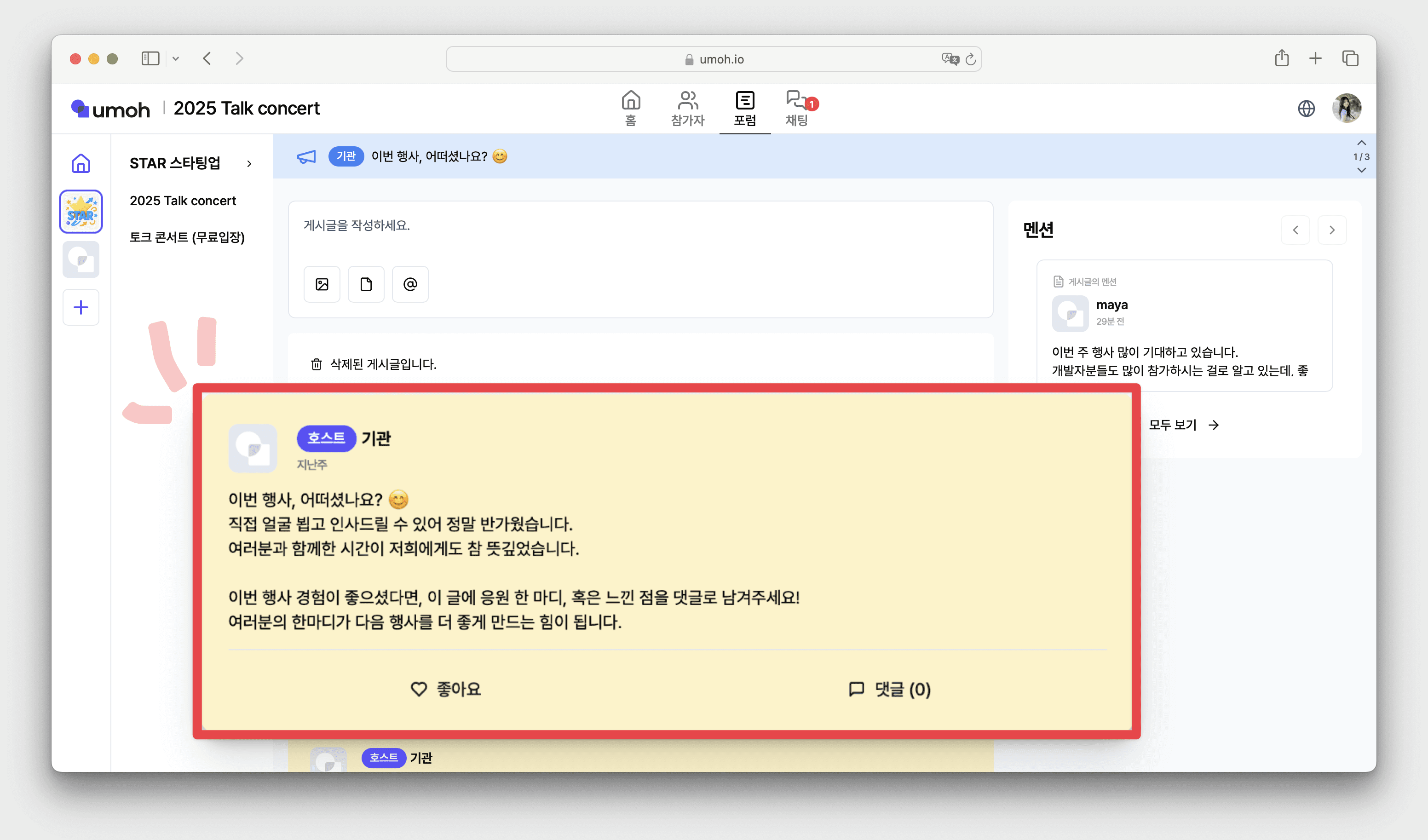 호스트가 올린 공지는 포럼탭에서 '노란색'으로 표시되어 있어요.