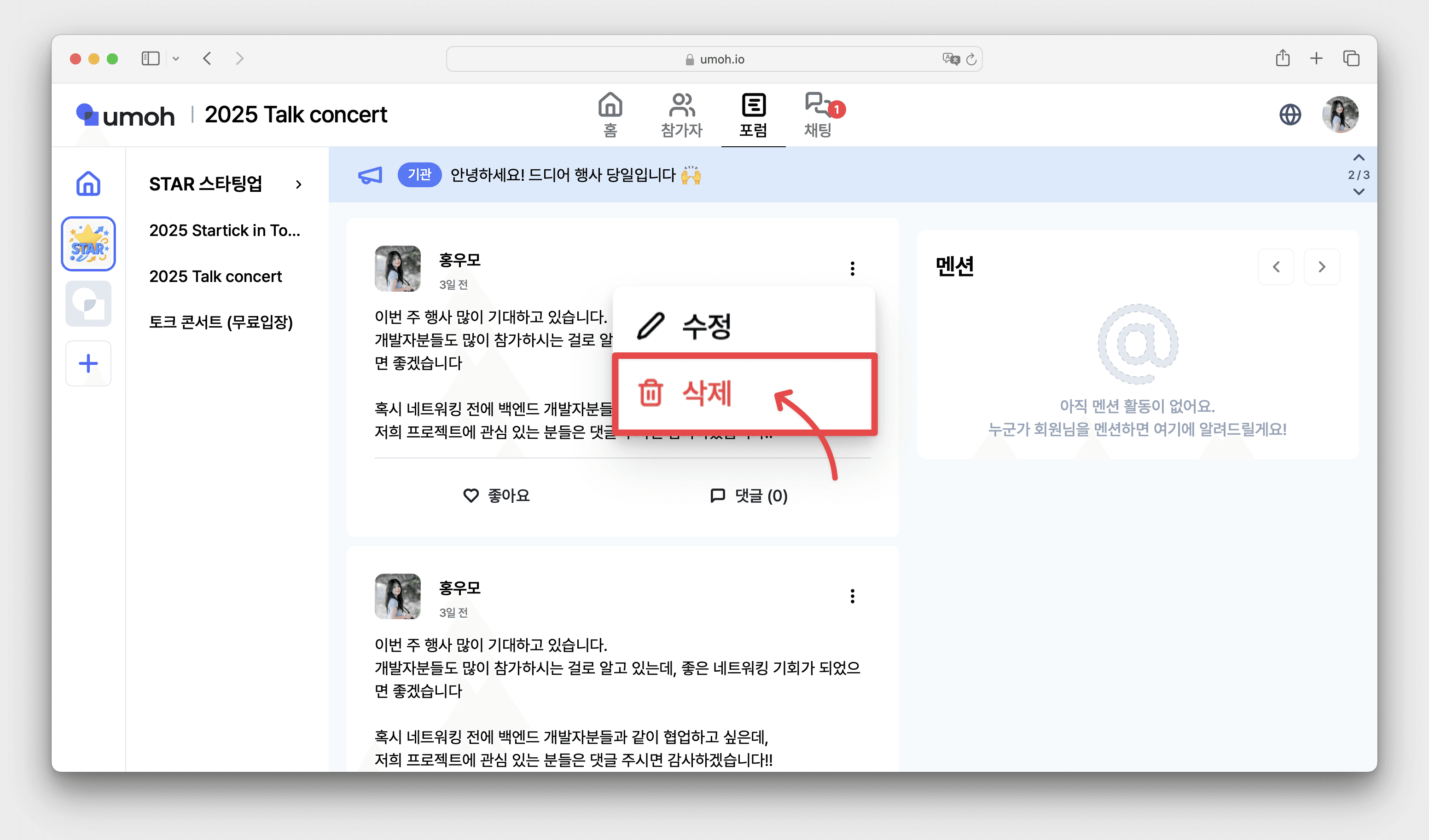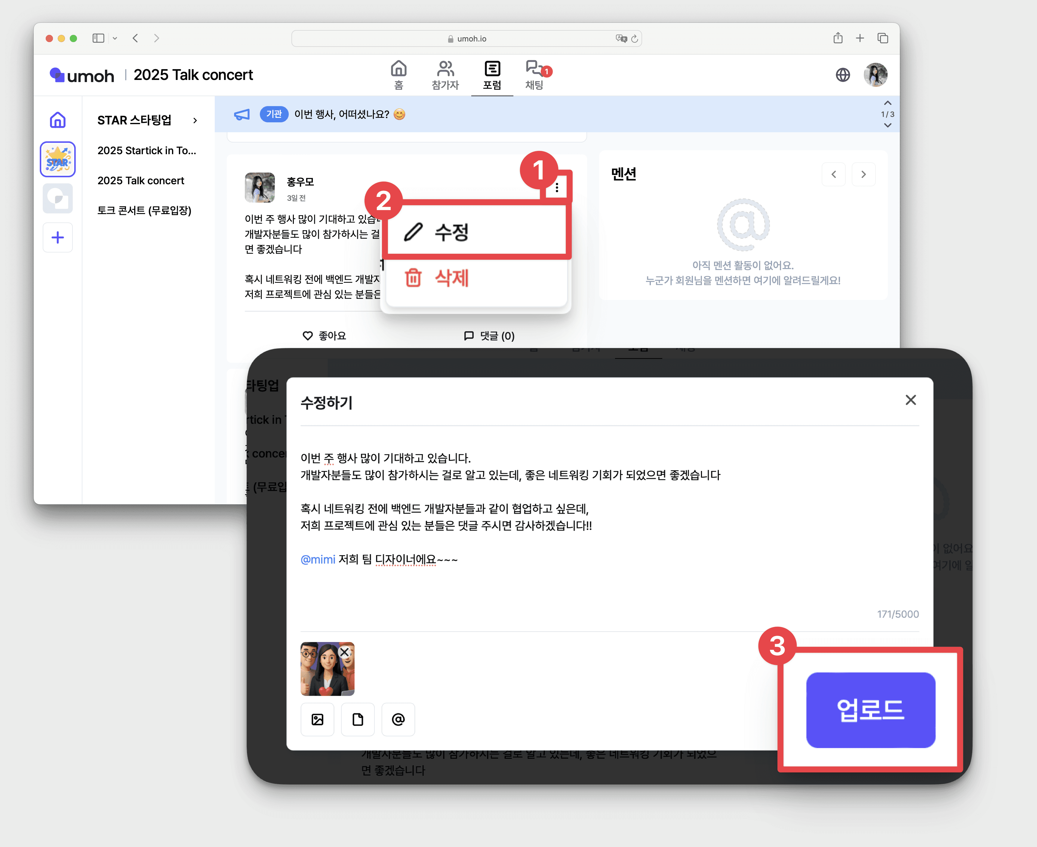 이미 업로드한 포럼의 내용, 사진, 파일, 멘션을 수정하는 방법입니다.