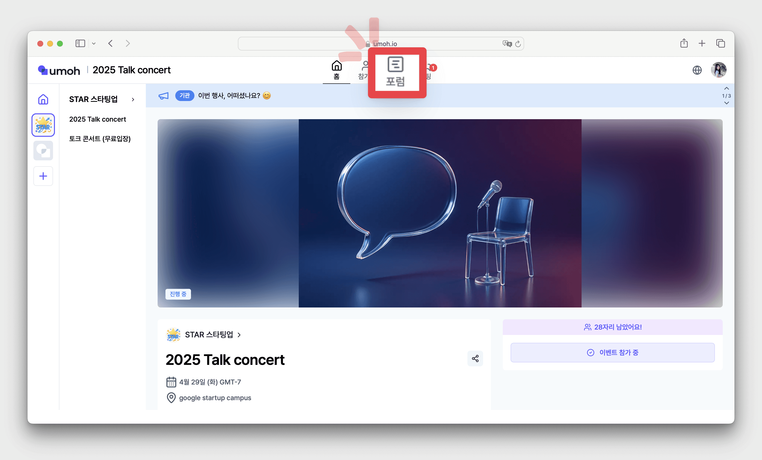 포럼은 참가자끼리 소통할 수 있는 커뮤니티 공간이에요.