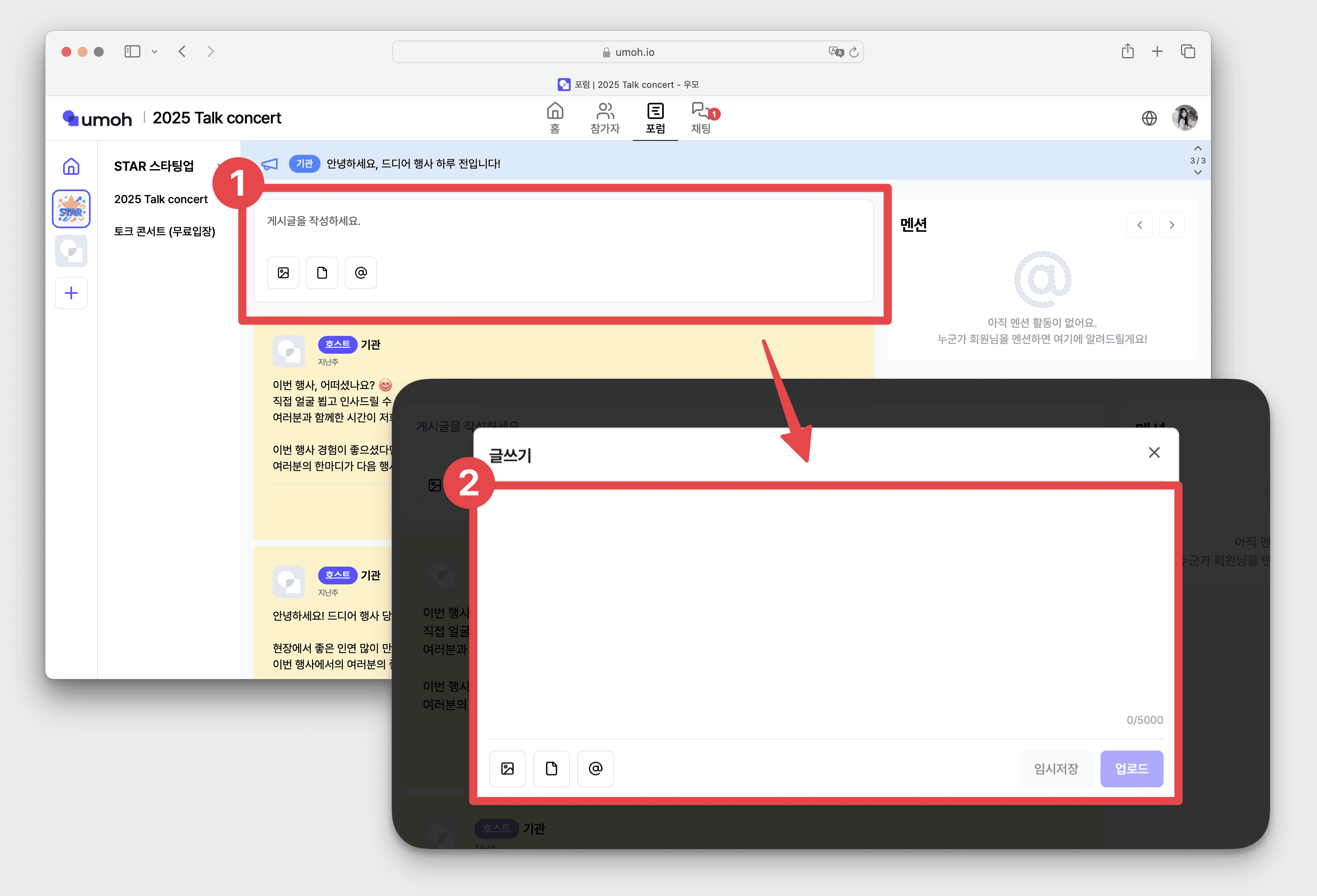 내용 작성 → [사진, 파일, 멘션] 추가 → [올리기] 클릭