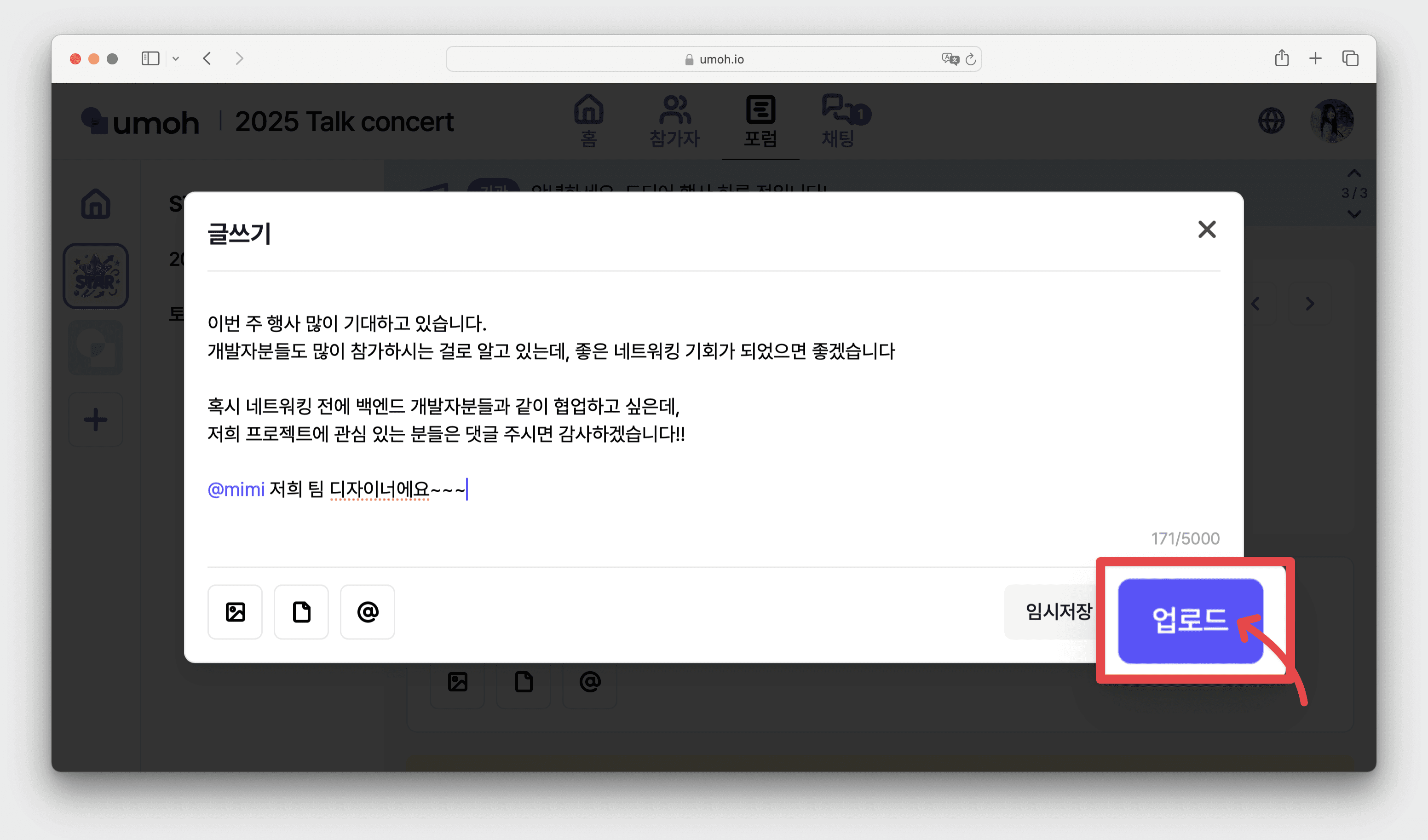 글쓰기 팝업 하단, 우측 [업로드] 버튼 클릭