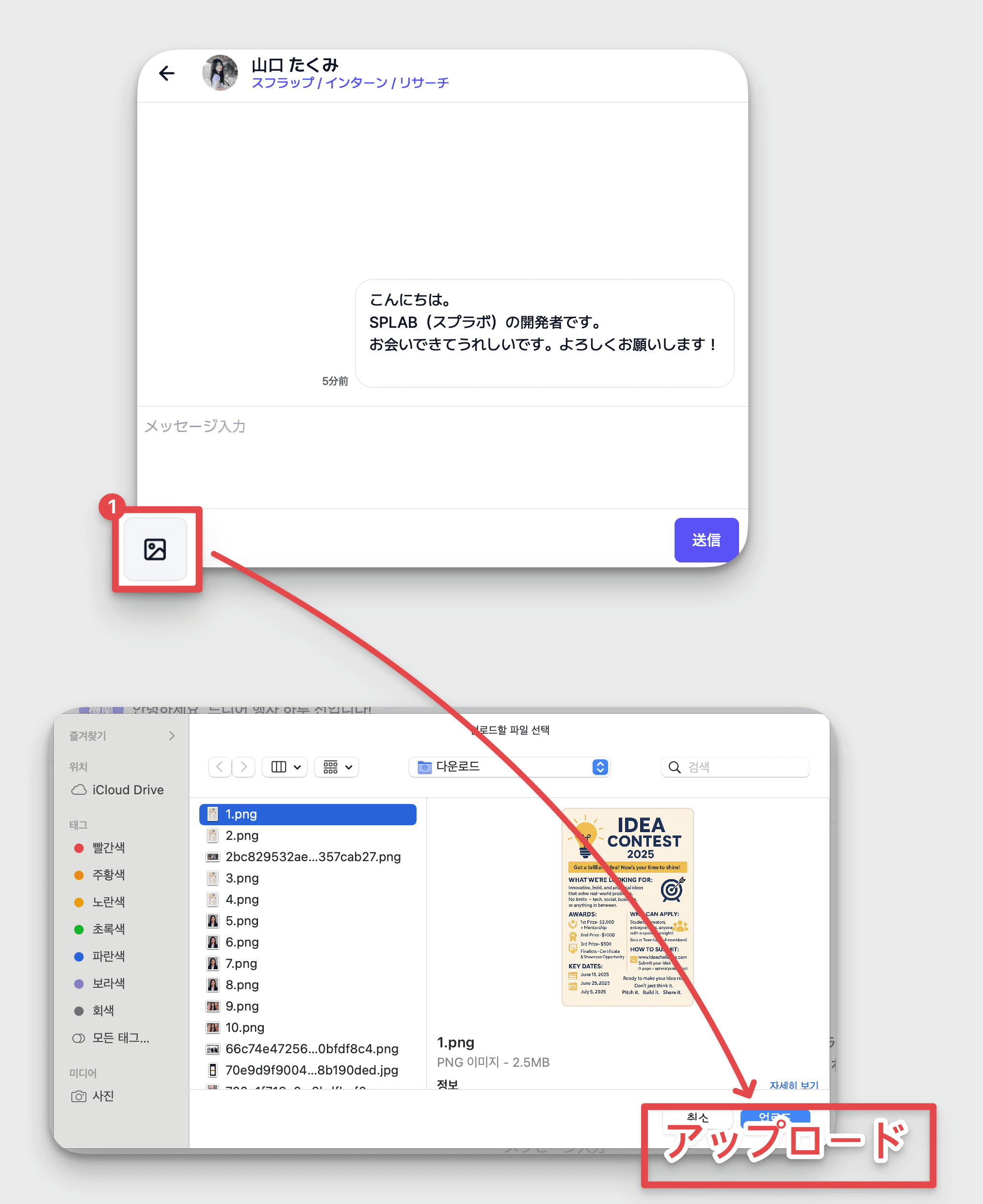 チャットウィンドウの下部にある[写真のアイコン]をクリック → 送りたい写真を選択 → [アップロード]