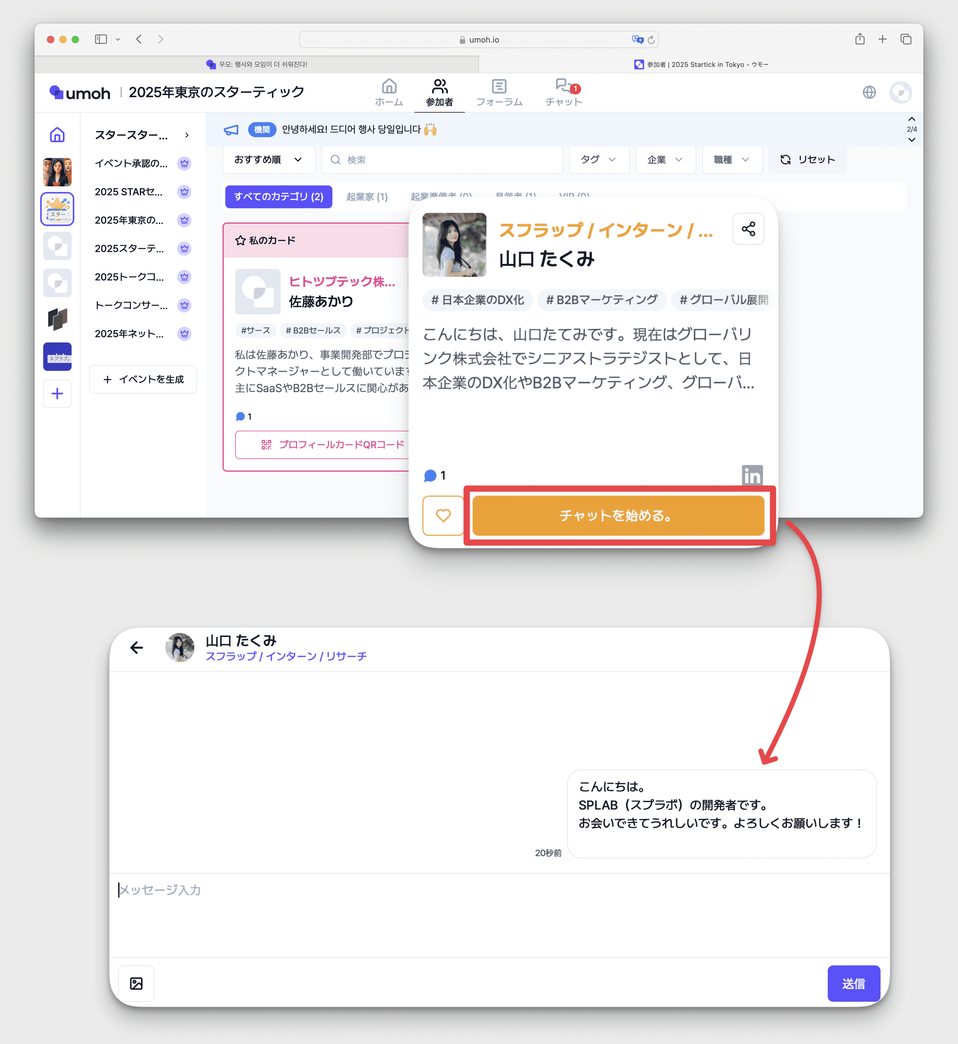 プロフィールカード下部の[チャットする]をクリック → 挨拶文を作成 → [送信] ※ プロフィールカード下部の[チャットアイコン]右側の[数字]はチャット数を意味します。