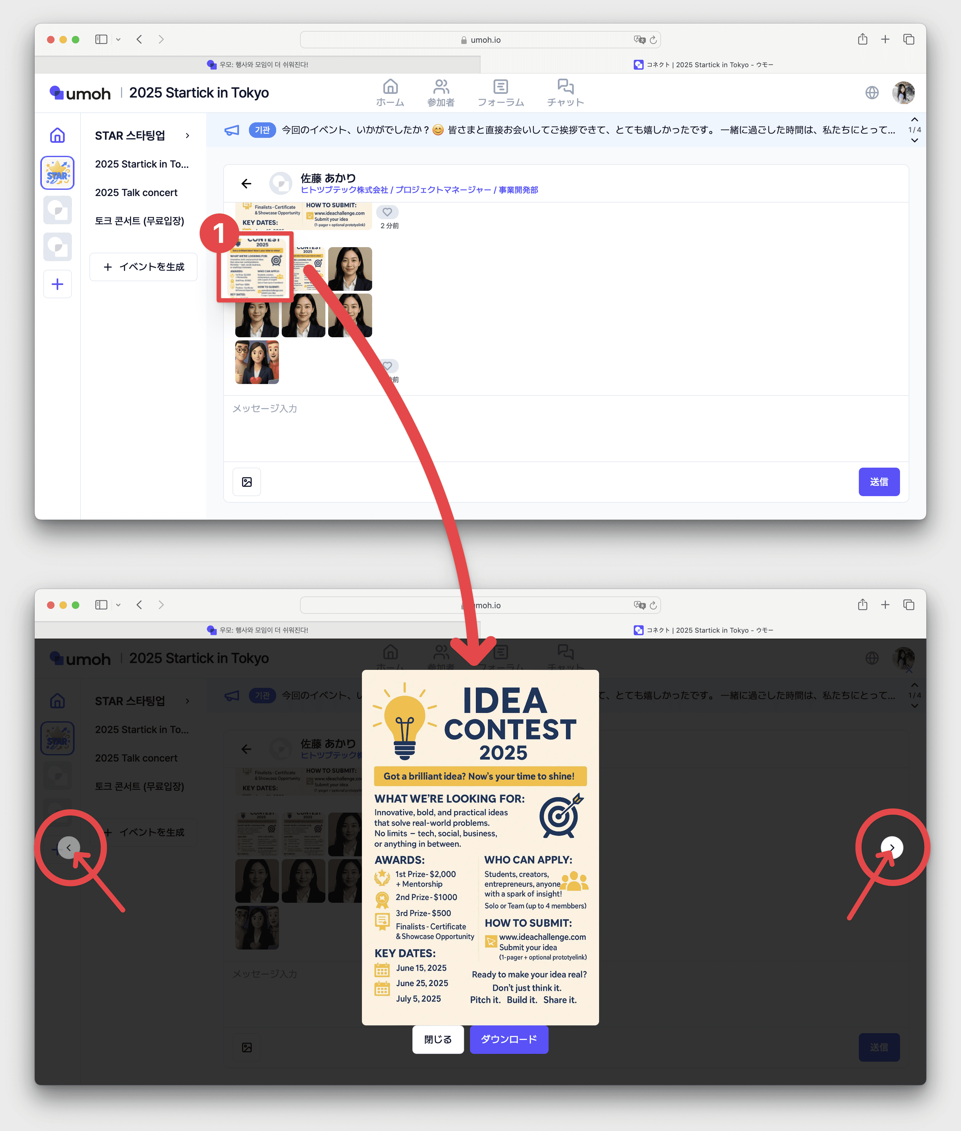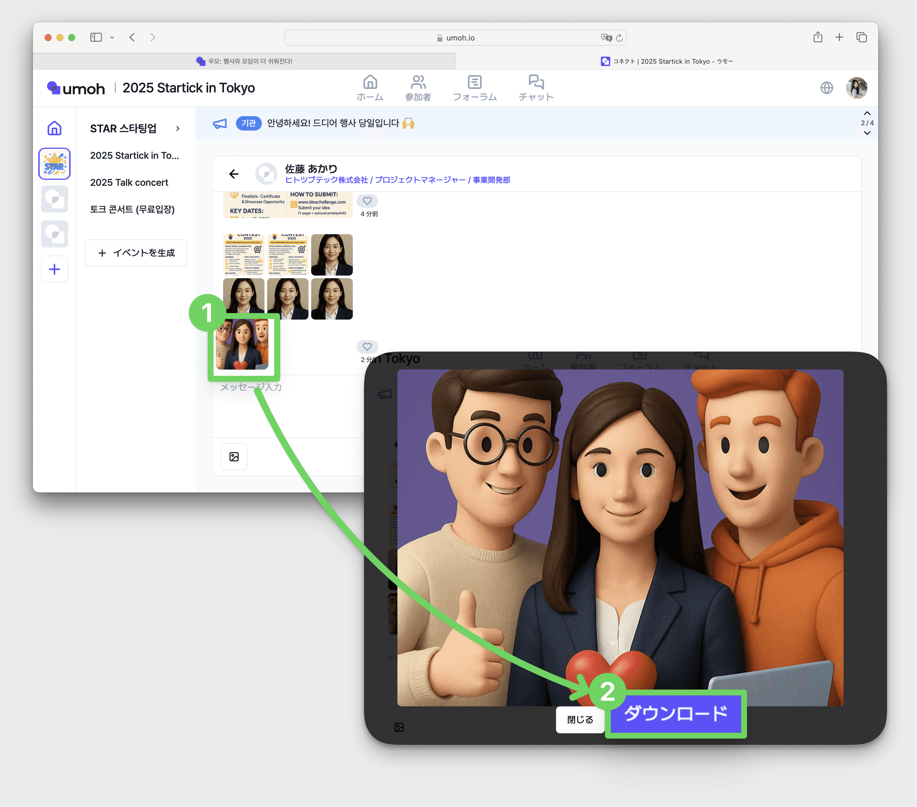 [フォーラム]の投稿者または参加者の[プロフィール写真]をクリック → [チャットする]をクリック
