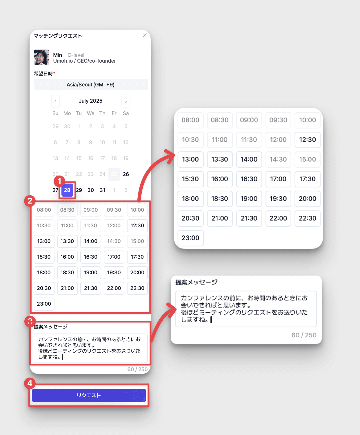 希望する[日付]、[時間]をクリック → [提案メッセージ]を作成 → [リクエスト]をクリック