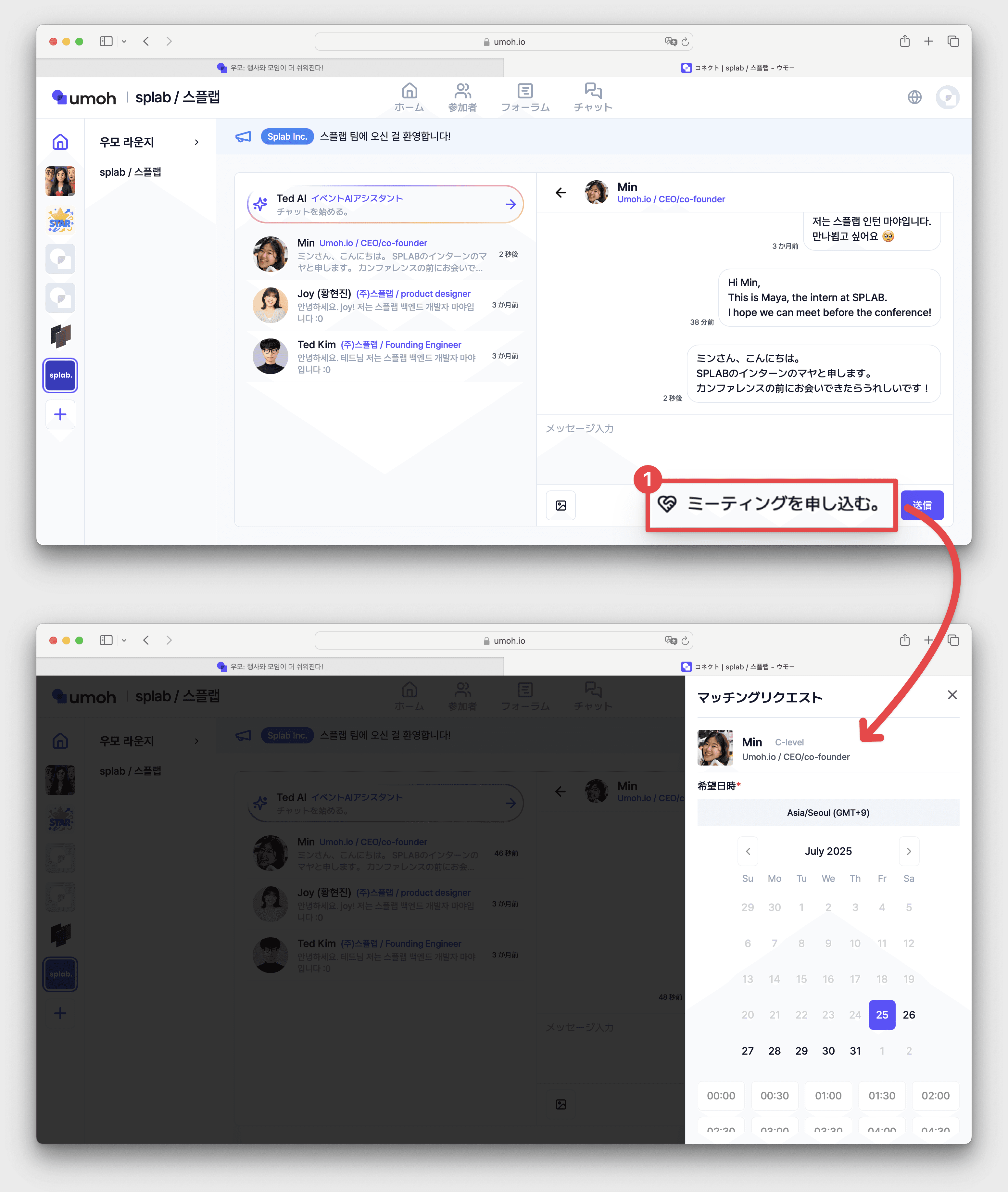 メッセージ入力欄の下にある[ミーティングリクエスト]をクリック → [ミーティングリクエスト]ポップアップが開きます