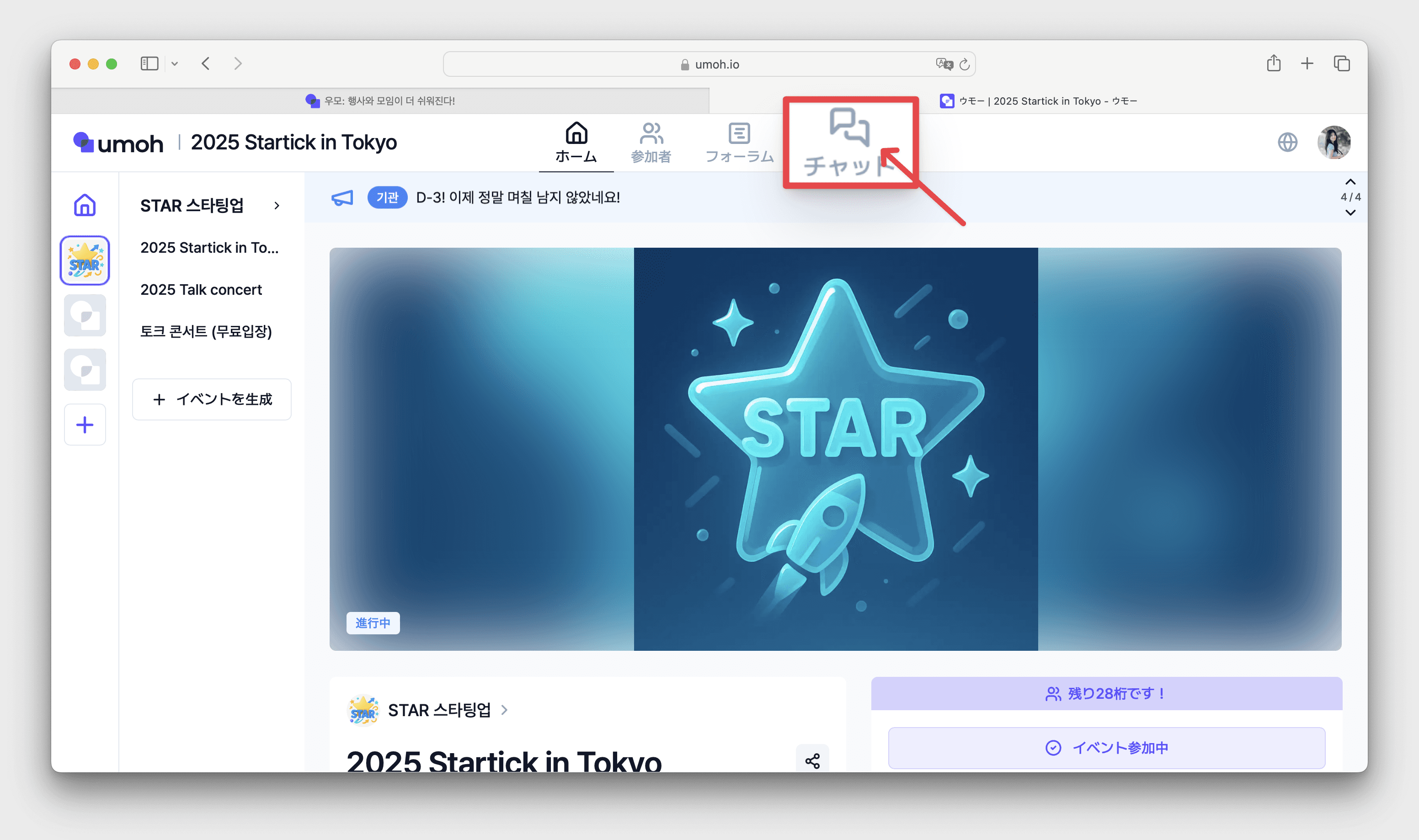 サイト上部の[チャットタブ] → チャットリスト確認可能