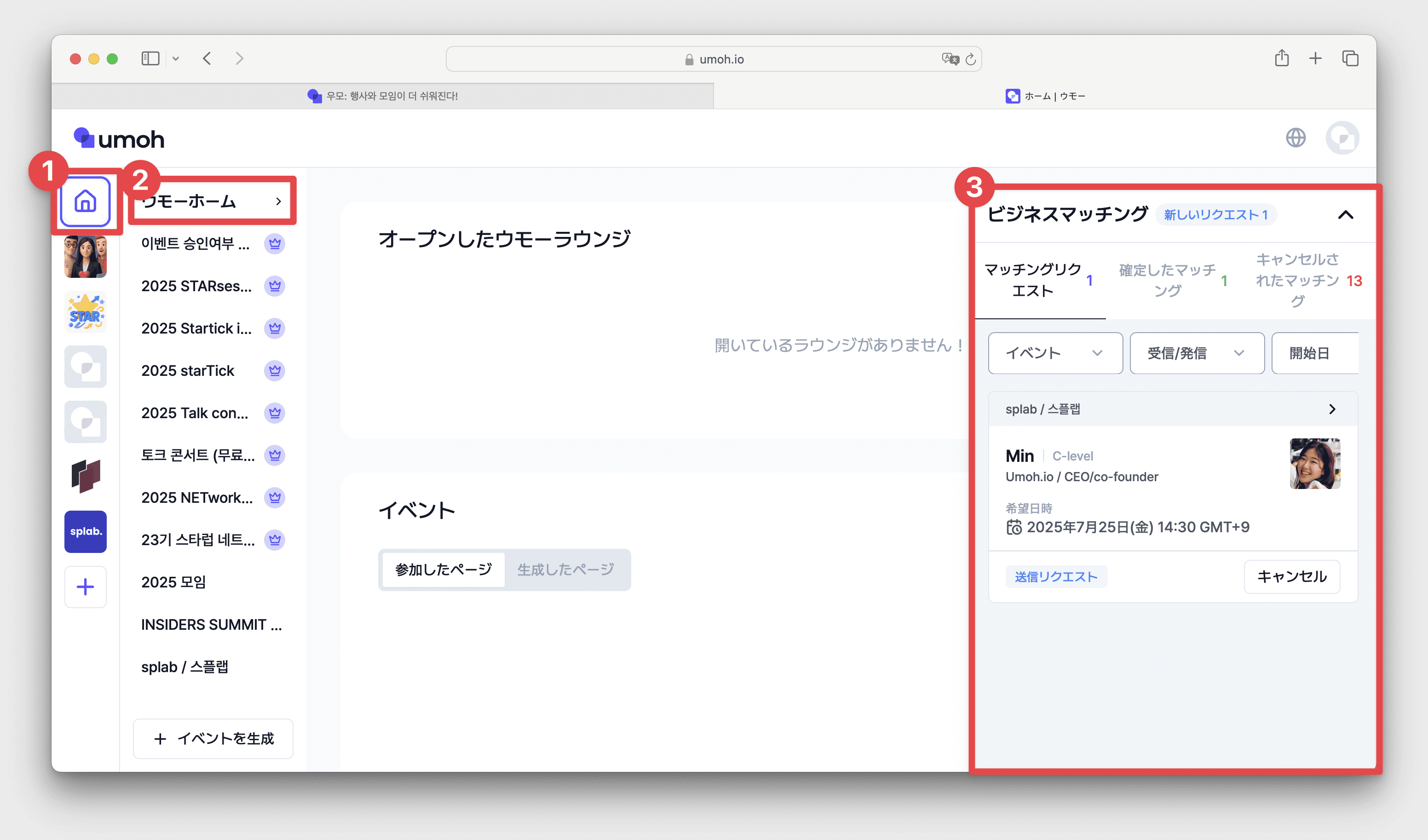 [ウモホーム]または[参加者タブ]下部の[ビズマッチング]バーでマッチングリクエストを確認できます。