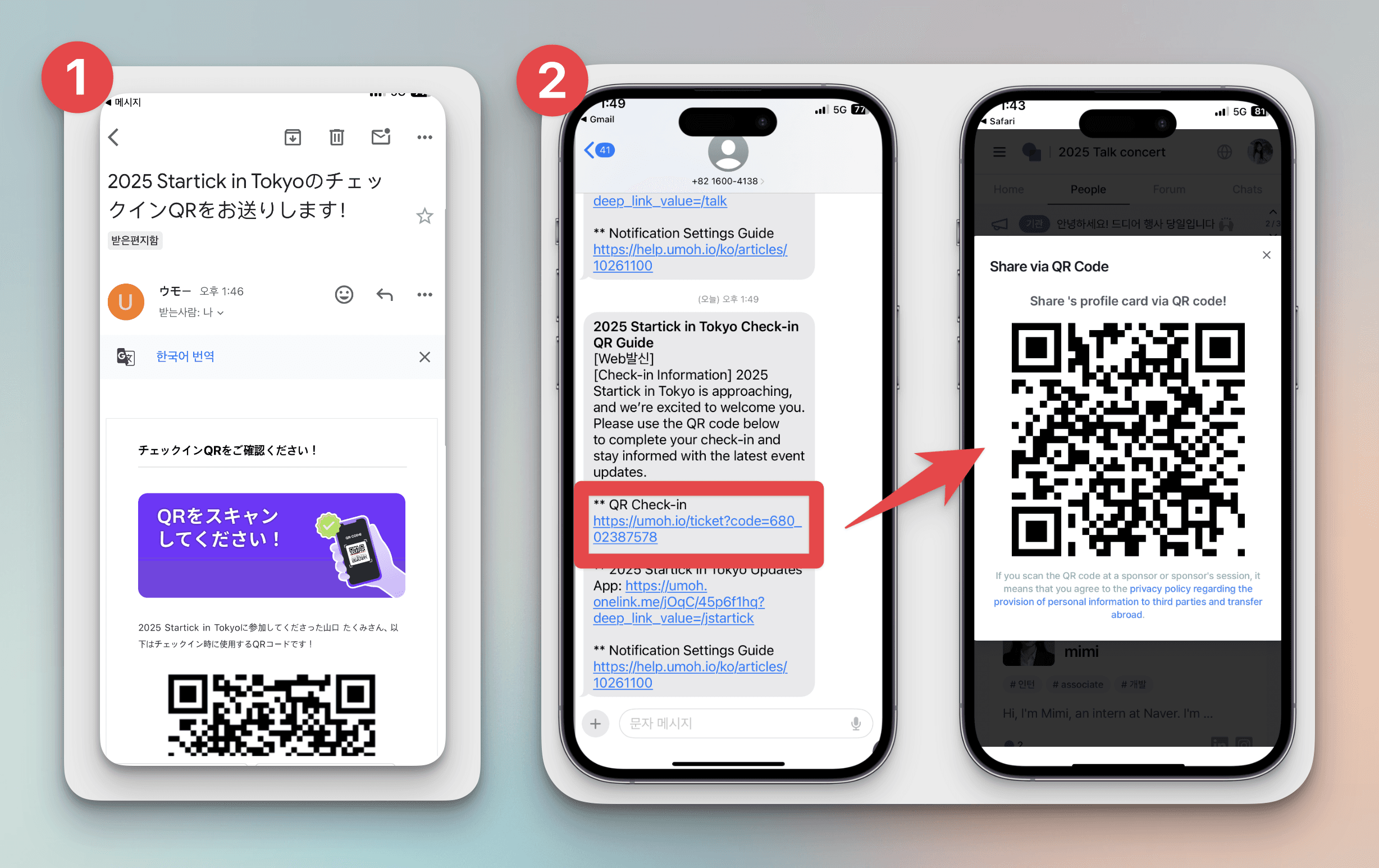 1. メールボックスの[チェックインQRメール]を開く → [QRコード]を確認