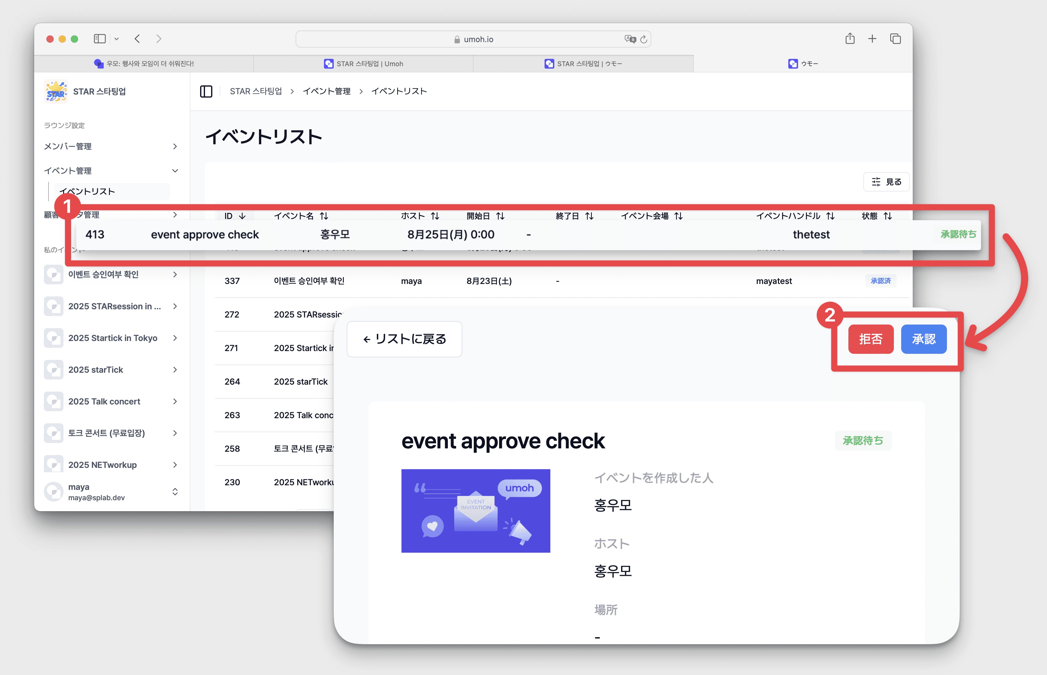 • [承認待ちイベント]をクリック → [拒否/承認]をクリック