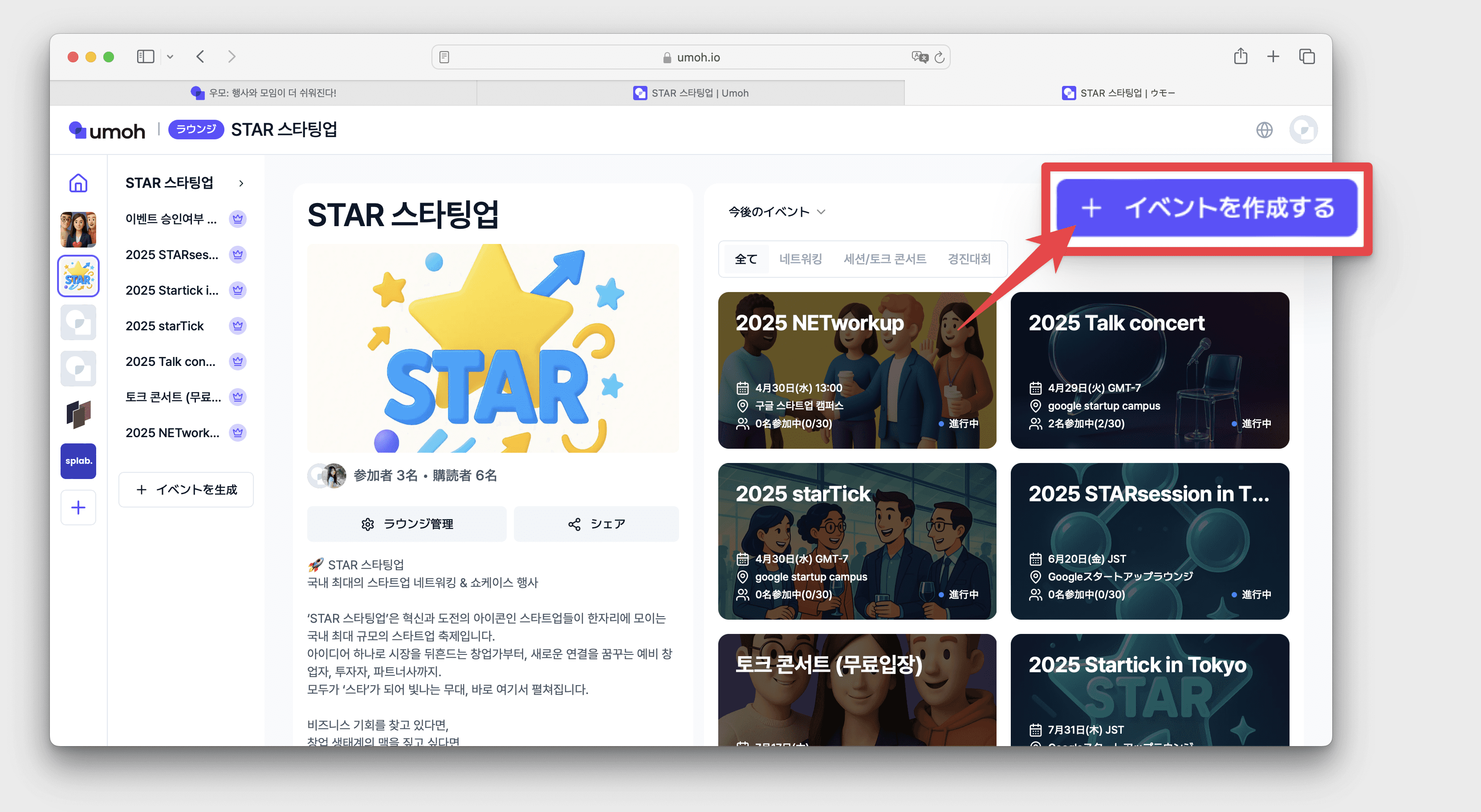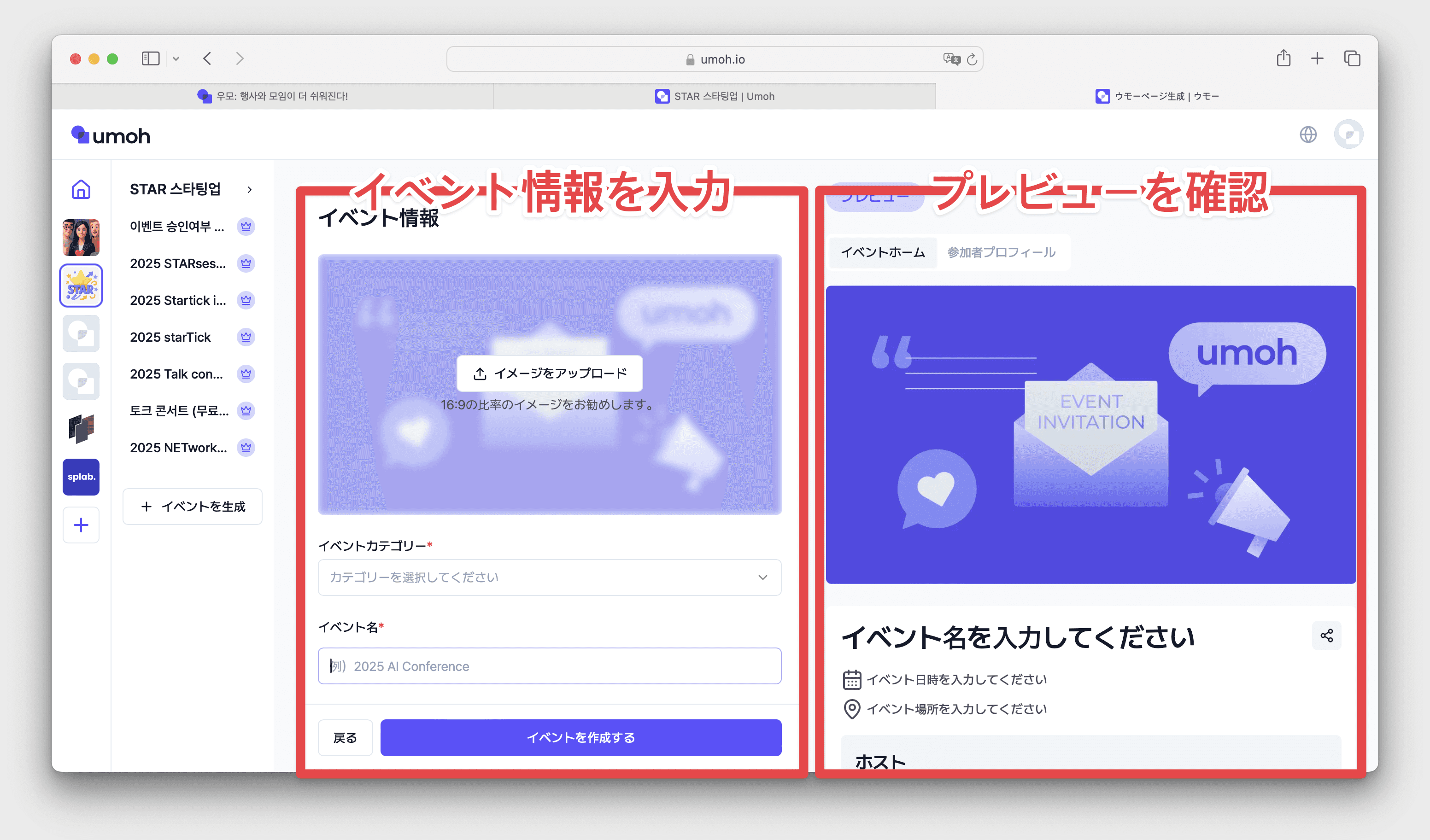 • または、左側のイベントリスト下部の[イベント作成]をクリック